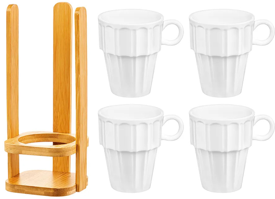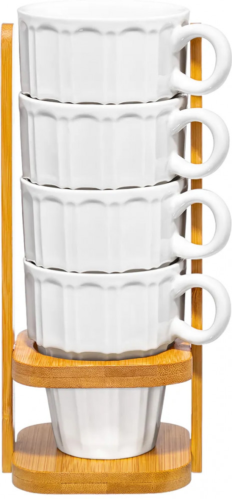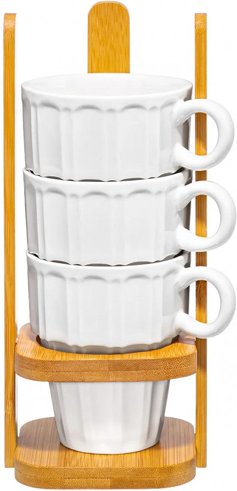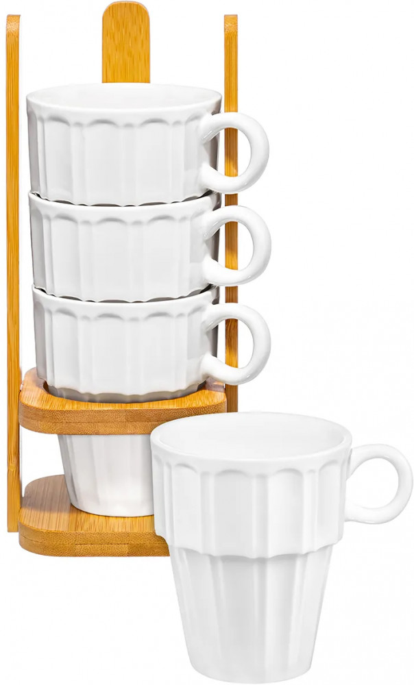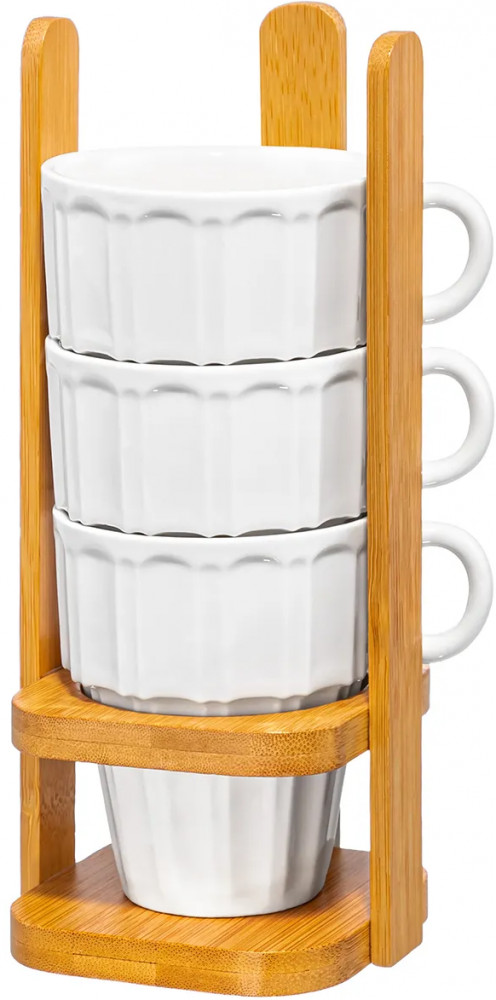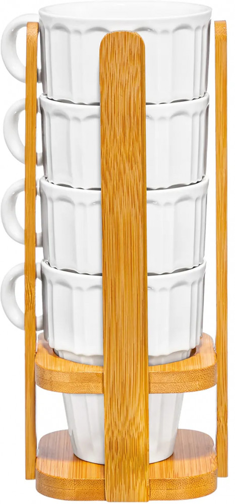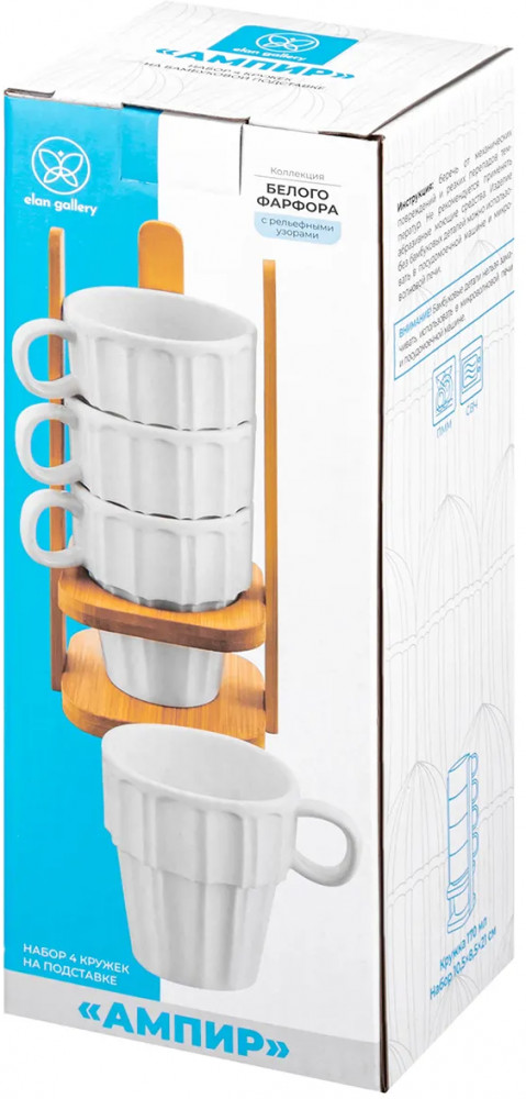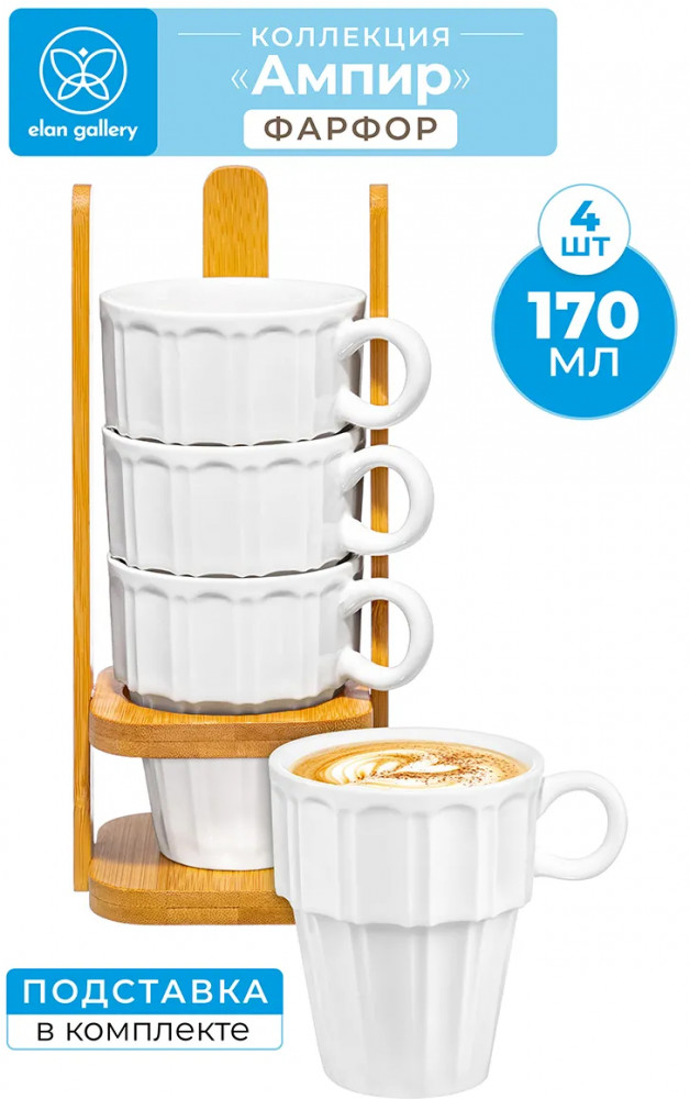 Серия: Ампир Набор 4 кружек из серии «Ампир» от Elan Gallery предназначен для эстетичной сервировки вашего стола. Полный размер комплекта — 10,5×8,5×21 см. Размер подставки — 8,5×8,5×20,5 см. Выполнена из натурального бамбука. Размер каждой ёмкости — 10×7,3×8,5 см, объём — 170 мл. Изготовлены из высококачественного белого фарфора. Он не впитывает цвет продуктов и легко отмывается, благодаря чему надолго сохраняет свою белизну. Поверхность изделия украшает элегантный ребристый рельеф. Декоративные кофейные кружечки помогут провести множество приятных завтраков с капучино и латте, а также уютные чайные вечера с конфетами, вафлями, другими десертами и сладостями. Подойдут ценителям чая и кофе, которые любят пить из красивой и необычной посуды.
