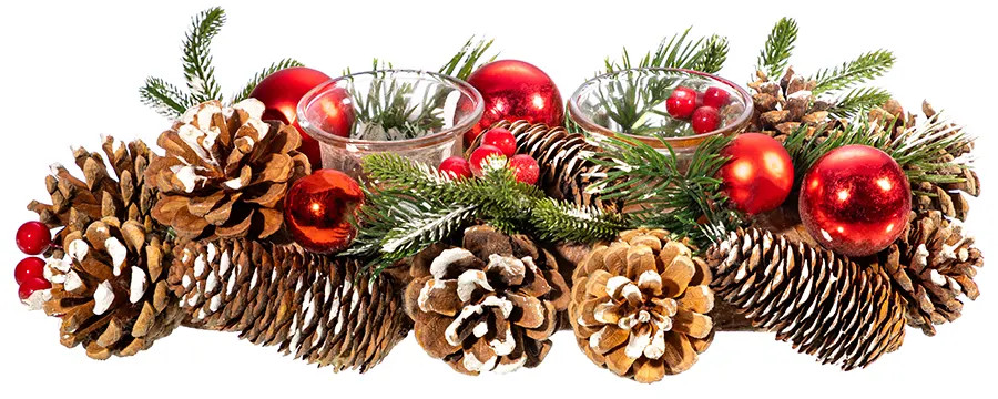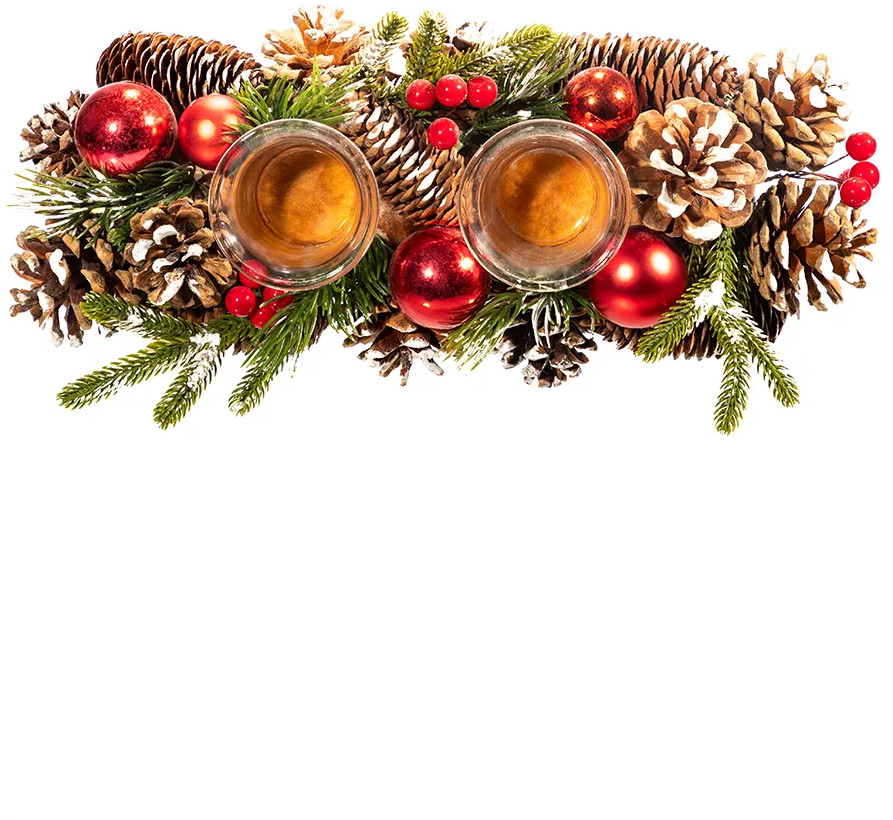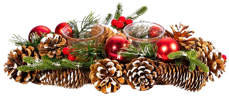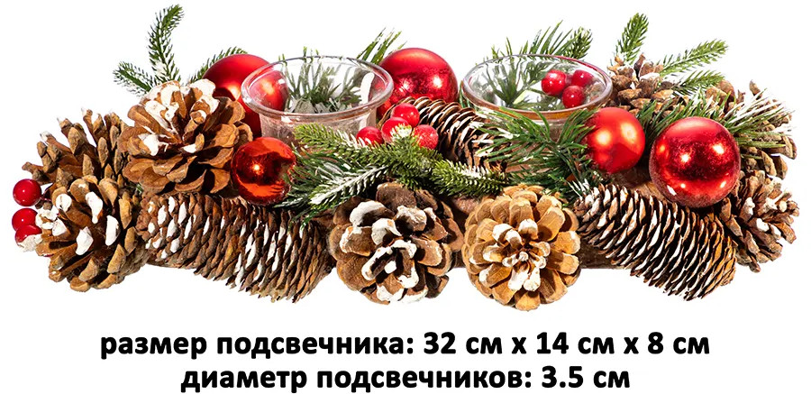 Новогоднее украшение (подсвечник) от Elan Gallery размером 32×14×8 см принесет в ваш дом атмосферу тепла, радости и уюта! Рождественский декор «Заснеженные шишки» представляет собой стеклянные стаканчики для 2 свечей, плотно закрепленных на толстой основе из пенопласта прямоугольной формы. Внутренний диаметр каждого стеклянного подсвечника — 3,5 см. Можно поставить на стол со скатертью, полку или тумбу. Плотная подставка украшена новогодним и рождественским декором. Вся композиция закреплена на прочной основе, каждый стакан из стекла приклеен, из подставки не вынимается. В составе использованы настоящие сосновые шишки, искусственные еловые ветки с красными новогодними шарами и декором в виде ягод.