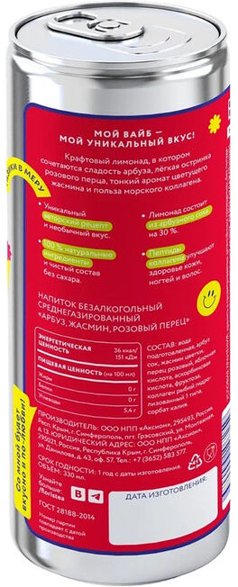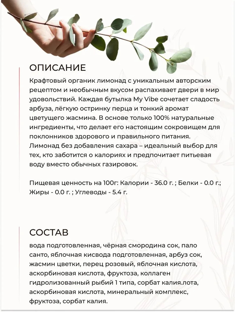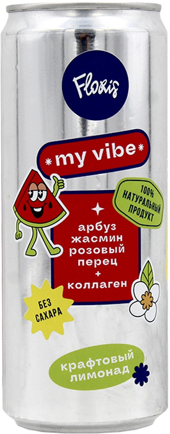 Крафтовый органик лимонад с уникальным авторским рецептом и необычным вкусом распахивает двери в мир удовольствий. Каждая бутылка My Vibe сочетает сладость арбуза, лёгкую остринку перца и тонкий аромат цветущего жасмина. В основе только 100% натуральные ингредиенты, что делает его настоящим сокровищем для поклонников здорового и правильного питания. Этот оригинальный напиток станет украшением вашего стола благодаря своей эстетичной упаковке, а также его можно поставить в холодильник или взять с собой на пикник или в путешествие.