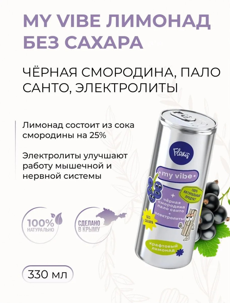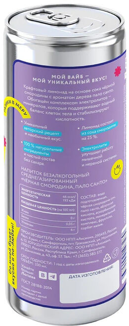 Лимонад с уникальным авторским рецептом! Этот крафтовый напиток на основе сока чёрной смородины с ароматом дерева пало санто подарит вам настоящее удовольствие. Продукт обогащён комплексом электролитов — важными минералами, поддерживающими водный баланс тела и стабилизирующими кислотность. Лимонад состоит из сока смородины на четверть. Секрет успеха — натуральные ингредиенты и чистый состав без сахара. Вы можете наслаждаться любимым вкусом без вреда для здоровья. Для детей это просто находка! Напиток подходит для правильного питания и свежего перекуса.