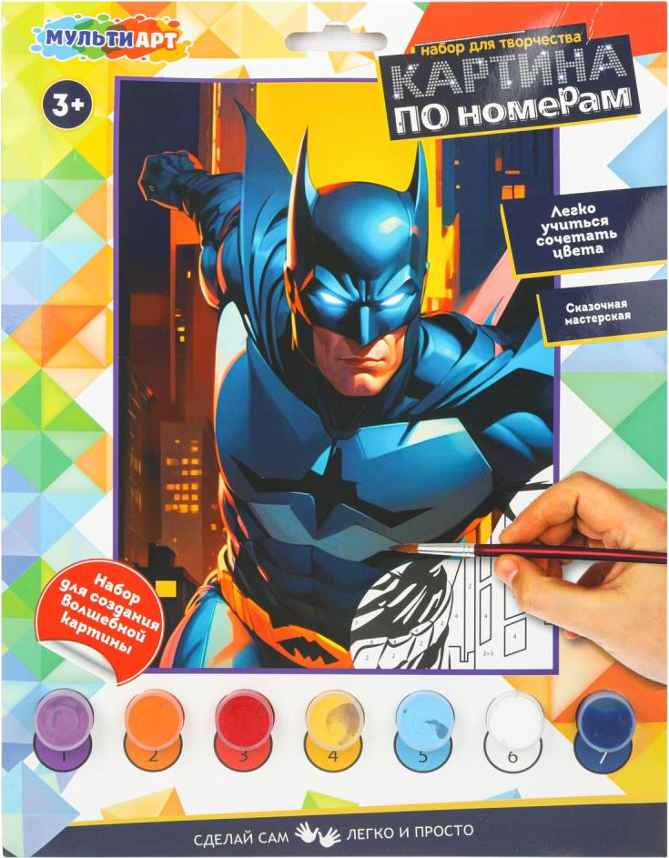 Набор для творчества — картина по номерам «Ночной герой» ТМ «Мульти Арт» — отличный подарок для ребёнка, который будет способствовать развитию его творческих способностей. С помощью этого набора маленький художник сможет самостоятельно нарисовать красивую картинку с изображением супергероя. Всё, что требуется — это подобрать цвет в соответствии с нумерацией на передней части коробки. Готовую поделку можно подарить близким или использовать для украшения интерьера. |