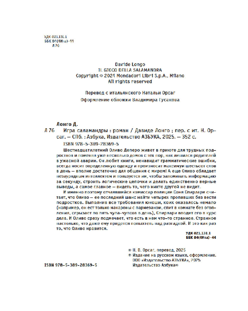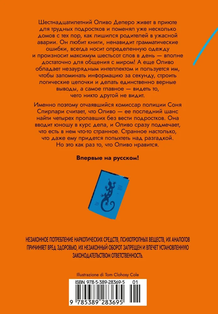 И именно поэтому отчаявшийся комиссар полиции Соня Спирлари считает, что Оливо — ее последний шанс найти четырех пропавших без вести подростков. Выполнив все требования юноши, коих оказалось немало (например, он ест только макароны с пармезаном, спит в комнате без отопления, сгрызает по пять чупа-чупсов в день), Спирлари вводит его в курс дела. И Оливо сразу подмечает, что есть в нем что-то странное. Странное настолько, что даже ему придется попыхтеть над разгадкой. И это как раз то, что Оливо нравится.