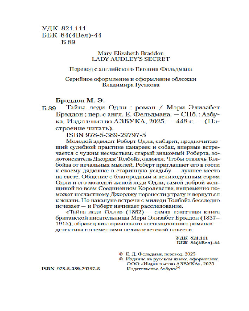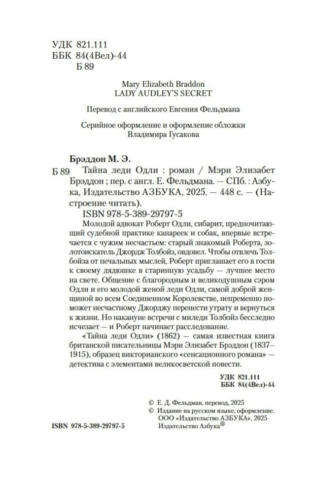 Серия: Настроение читать Молодой адвокат Роберт Одли, сибарит, предпочитающий судебной практике канареек и собак, впервые встречается с чужим несчастьем: старый знакомый Роберта, золотоискатель Джордж Толбойз, овдовел. Чтобы отвлечь Толбойза от печальных мыслей, Роберт приглашает его в гости к своему дядюшке в старинную усадьбу — лучшее место на свете. Общение с благородным и великодушным сэром Одли и его молодой женой леди Одли, самой доброй женщиной во всем Соединенном Королевстве, непременно поможет несчастному Джорджу перенести утрату и вернуться к жизни. Но накануне встречи с миледи Толбойз бесследно исчезает — и Роберт начинает расследование. |