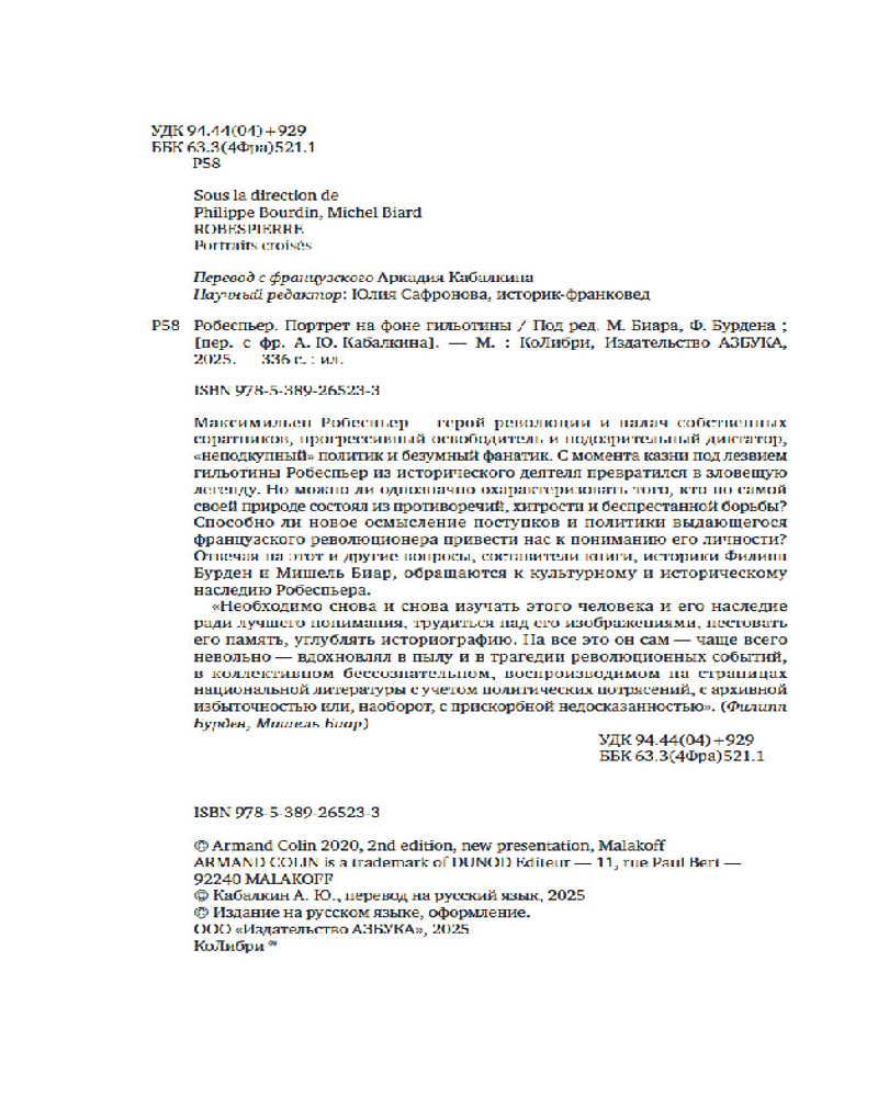 Серия: Персона Максимильен Робеспьер — герой революции и палач собственных соратников, прогрессивный освободитель и подозрительный диктатор, «неподкупный» политик и безумный фанатик. С момента казни под лезвием гильотины Робеспьер из исторического деятеля превратился в зловещую легенду. Но можно ли однозначно охарактеризовать того, кто по самой своей природе состоял из противоречий, хитрости и беспрестанной борьбы? Способно ли новое осмысление поступков и политики выдающегося французского революционера привести нас к пониманию его личности? Отвечая на этот и другие вопросы, составители книги, историки Филипп Бурден и Мишель Биар, обращаются к культурному и историческому наследию Робеспьера. |