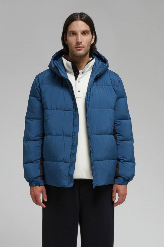 Утепленная стеганая куртка с контрастными вставками по бокам выполнена из технологичной ткани с водоотталкивающей пропиткой. Материал надежно защищает от дождя, устойчив к загрязнениям и отличается износостойкостью.