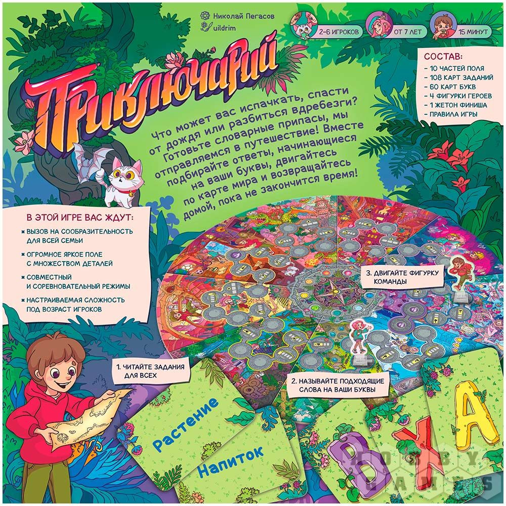 «Приключарий» — это увлекательная игра, близкий родственник «Соображария». Вы будете тянуть две карты: одна из них — карта буквы, вторая — вопроса. Сможете ответить, что начинается на букву «Ш» и способно укрыть вас от дождя? Правильно, шляпа! А что на букву «З» может разбиться на десятки мелких осколков? Ну, допустим, зеркало. В общем, вы поняли принцип. Каждый раз, когда вы даёте правильный ответ, вы продвигаетесь вперёд по красочному и детализированному полю. Можно играть командами, а можно — каждый сам за себя. Задача одинаковая — как можно быстрее преодолеть все остановки и вернуться домой, потому что, как известно, в гостях хорошо, а дома лучше. И да, к приключениям это тоже относится. |