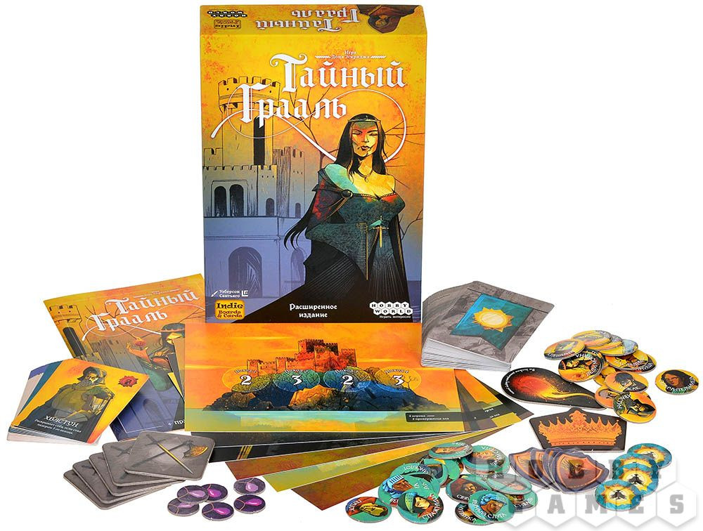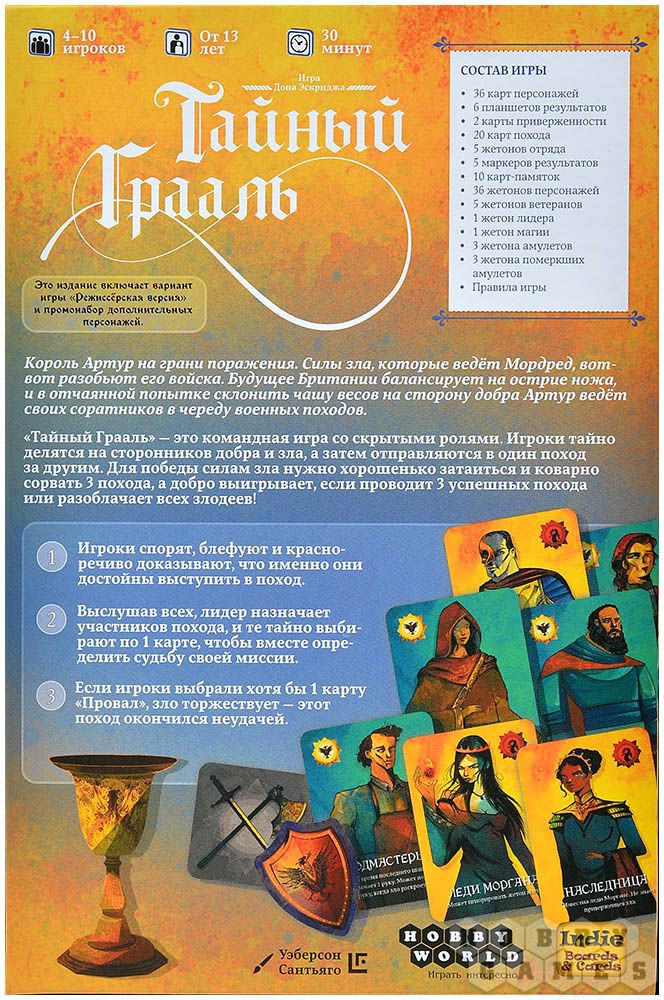 «Тайный Грааль» — это командная игра со скрытыми ролями. Участники тайно разделяются на приверженцев добра и зла, после чего отправляются в череду походов. Чтобы одержать победу, силы зла должны скрытно действовать и саботировать 3 похода, тогда как добро побеждает, успешно завершив их, или раскрыв всех злодеев. Игроки вступают в споры, используют блеф и убедительные аргументы, доказывая, что именно они достойны участвовать в походе. После обсуждения лидер выбирает участников миссии, и те втайне выкладывают по одной карте, определяя исход похода. Если среди выбранных карт оказывается хотя бы одна карта «Провал», зло празднует победу — миссия провалена. Кстати, в это издание включены вариант игры «Режиссёрская версия», а также промонабор дополнительных персонажей. |