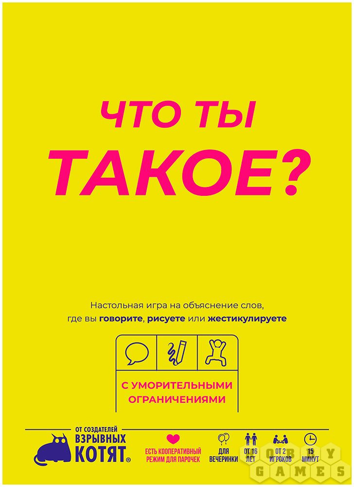 «Что ты такое?» могла стать очередной игрой на объяснение слов разными способами, при взгляде на которую в голове появлялся бы вопрос, украшающий коробку. Но она не стала! А всё благодаря своей изюминке — забавным ограничениям, превращающим игровой процесс в театр абсурда и нескончаемой уморы. Вот представьте: вы вытянули карту задания, а она говорит вам объясняться рисунком, но в процессе ваша голова должна лежать на столе. Или вы должны объяснить слово жестами, но в это время вы обязаны кружиться вокруг себя всё время. Звучит безумно, не правда ли? А выглядит ещё безумнее и смешнее, отчего в голове и возникает тот самый вопрос: да что же ты такое? |