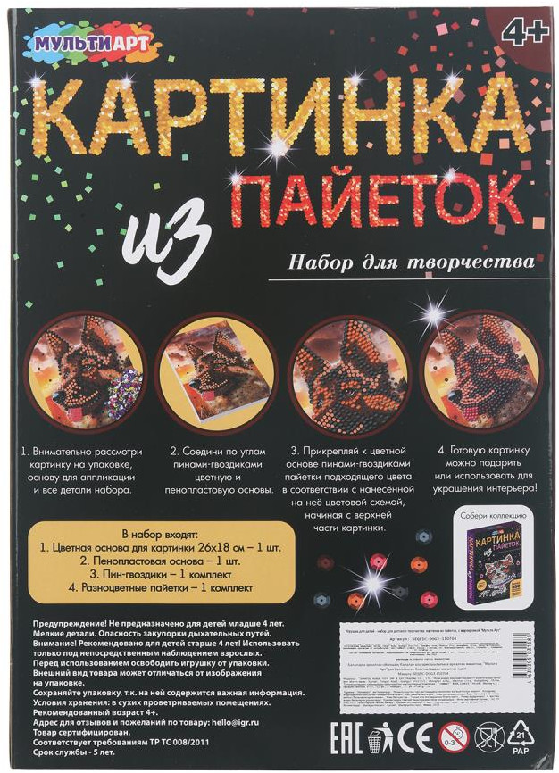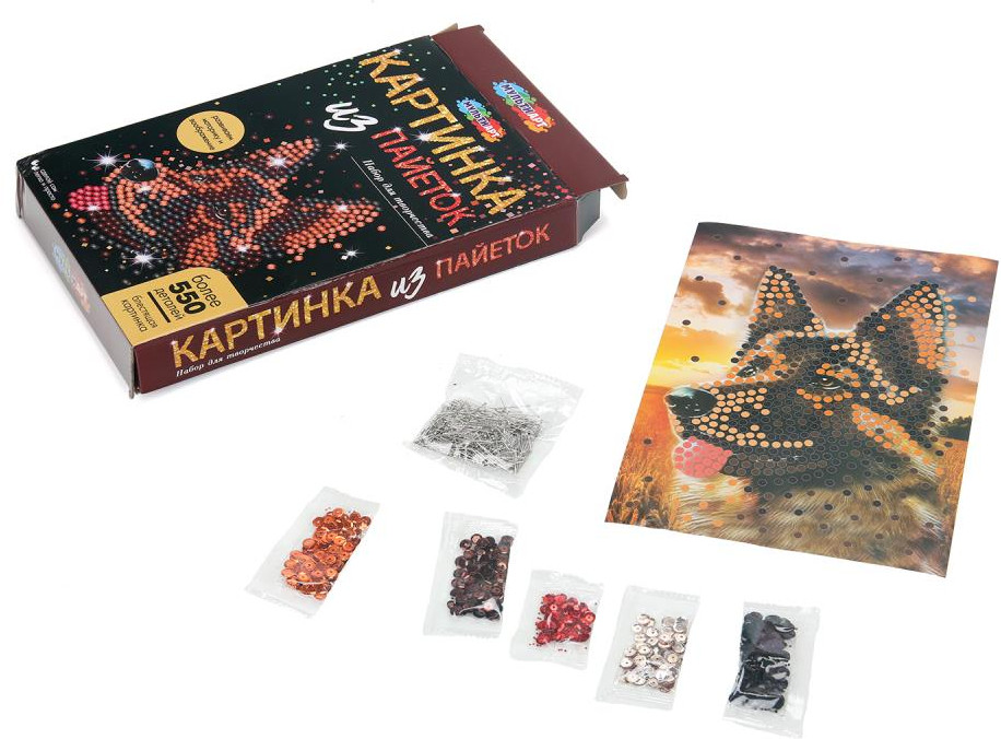 Набор для творчества — картина из пайеток «Собака» ТМ «Мульти Арт» — отличный подарок для маленького художника. С помощью красочной основы и сверкающих пайеток, прикрепляемых к ней гвоздиками, ребёнок сможет самостоятельно создать красивую блестящую картину с изображением симпатичной собаки. Готовую поделку можно подарить близким или использовать для украшения интерьера. |