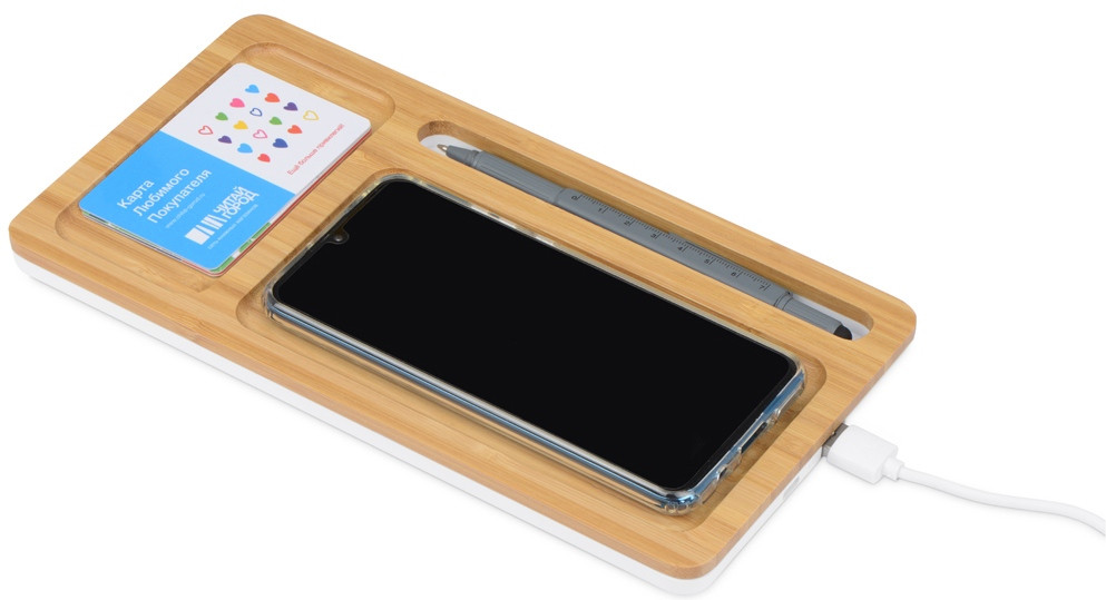 💳 Оплатить за товар можно при получении 🇰🇿 Есть бесплатная доставка по Казахстану 🎁 Копите бонусы с каждой покупки Органайзер Timber с функцией беспроводной зарядки — современный и стильный бизнес-подарок для поклонников экодизайна. Подойдет для хранения смартфона, ручки и визитных или клубных карт. Лаконичный дизайн с выраженной текстурой бамбука позволяет аксессуару гармонично вписаться практически в любой интерьер. В комплект входит кабель USB-C. Дополнительный плюс — выходной разъем USB. |