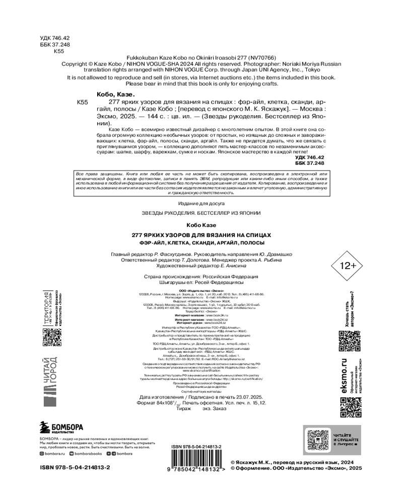 Серия: Звезды рукоделия. Бестселлер из Японии 277 узоров на все случаи жизни! В этой книге всемирно известный дизайнер с многолетним опытом Казе Кобо собрала огромную коллекцию необычных узоров: от простых, но изящных — для тех, кто впервые взял спицы в руки, до сложных и завораживающих — для опытных вязальщиц. При работе Казе Кобо сделала акцент на цветовых сочетаниях — вы точно найдете узор по вкусу. Также не придется думать, что же связать с приглянувшимся узором — коллекцию дополняют пять мастер-классов по незаменимым аксессуарам: шапке, шарфу, варежкам, сумке и носкам.  |