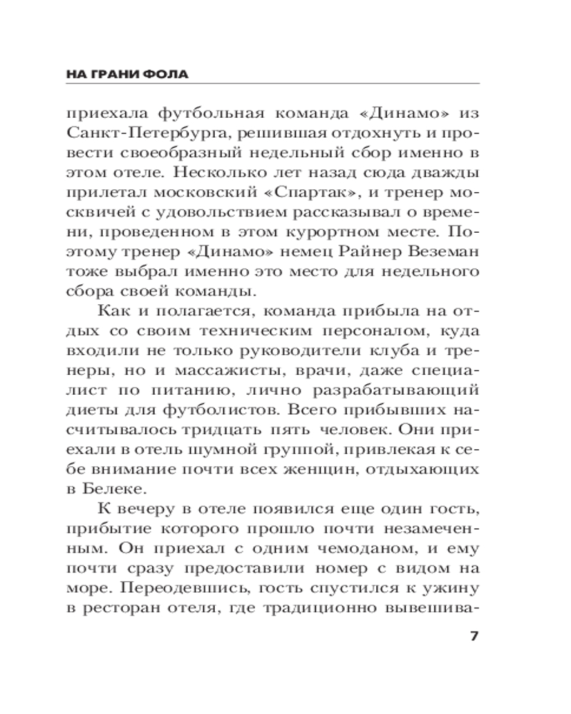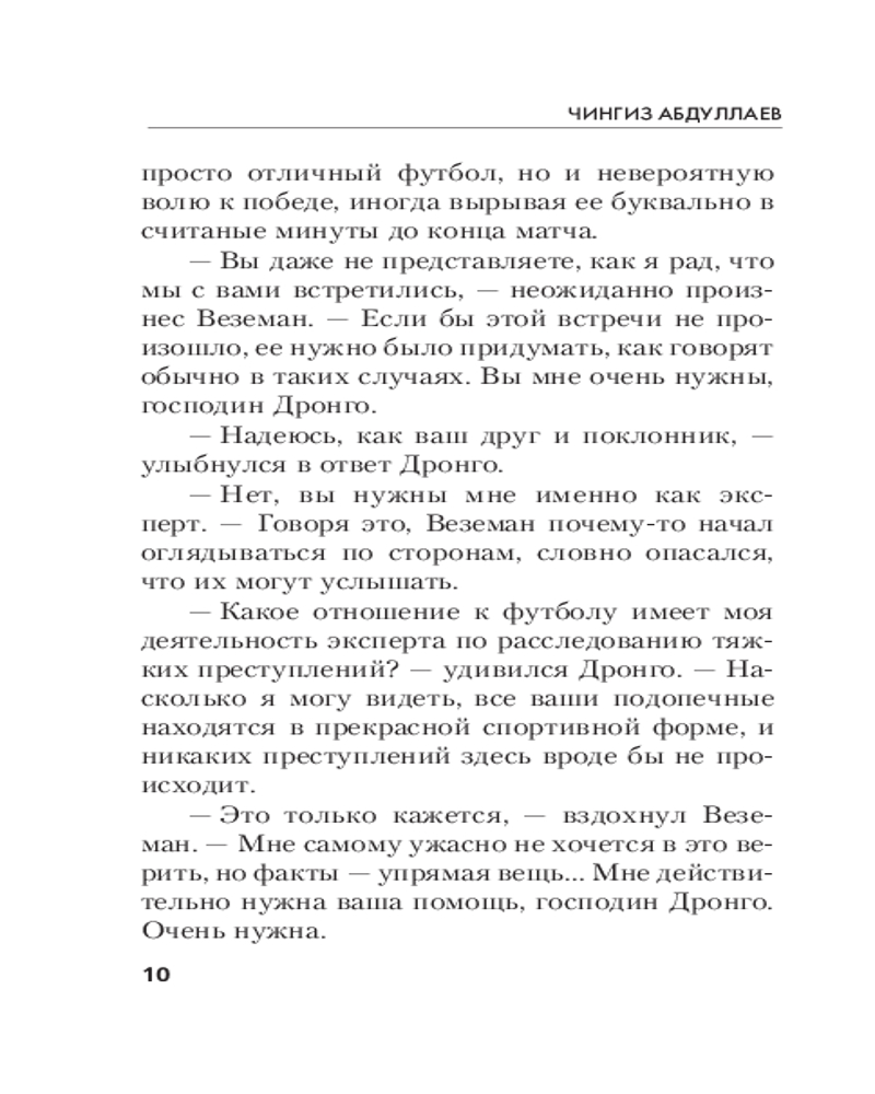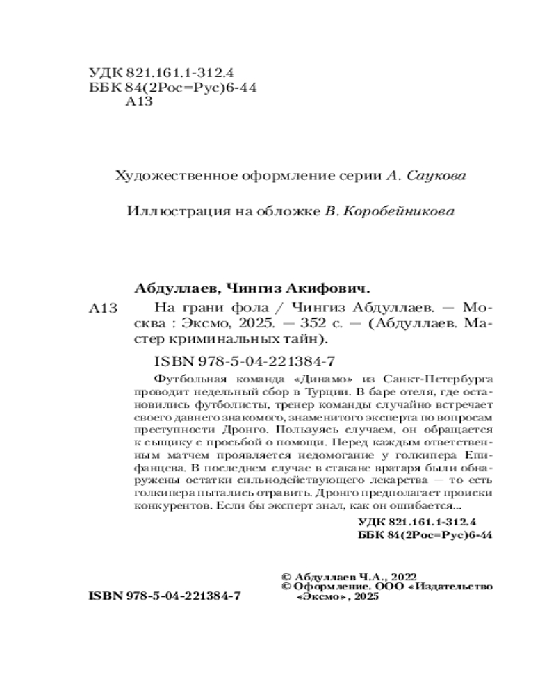 Серия: Абдуллаев. Мастер криминальных тайн (обложка) Футбольная команда «Динамо» из Санкт-Петербурга проводит недельный сбор в Турции. В баре отеля, где остановились футболисты, тренер команды случайно встречает своего давнего знакомого, знаменитого эксперта по вопросам преступности Дронго. Пользуясь случаем, он обращается к сыщику с просьбой о помощи. Перед каждым ответственным матчем проявляется недомогание у голкипера Епифанцева. В последнем случае в стакане вратаря были обнаружены остатки сильнодействующего лекарства — то есть голкипера пытались отравить. Дронго предполагает происки конкурентов. Если бы эксперт знал, как он ошибается... |