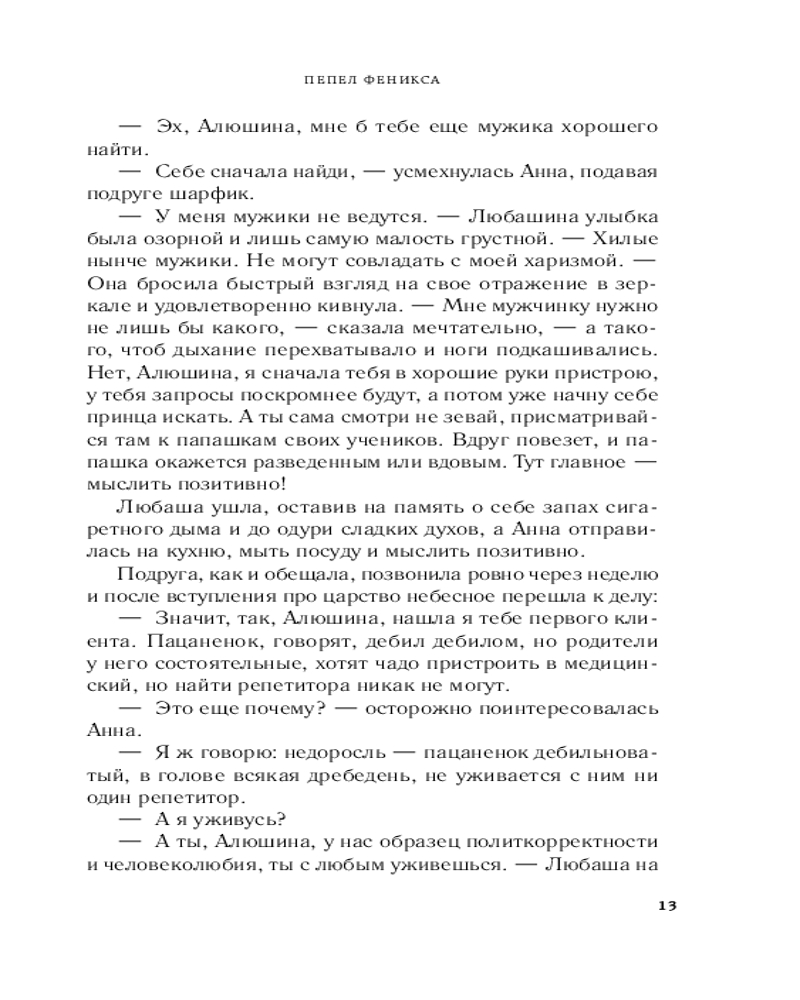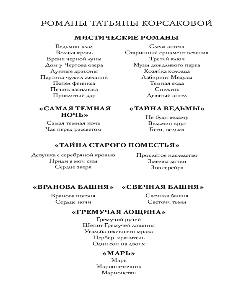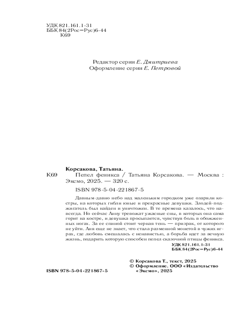 Серия: Татьяна Корсакова. Королева мистического романа. Новое оформление Давным-давно небо над маленьким городком уже озаряли костры, на которых гибли юные и прекрасные девушки. Злодей-поджигатель был найден и уничтожен. В те времена казалось, что навсегда. Но сейчас Анну тревожат ужасные сны, в которых она сама горит на костре, и девушка просыпается, чувствуя боль в обожженных ногах. За ее спиной стоит черная тень — призрак, от которого не уйти. Аня еще не знает, что стала разменной монетой в чужих играх, где любовь смешалась с ненавистью, а борьба идет за вечную жизнь, подарить которую способен пепел сказочной птицы феникса. |