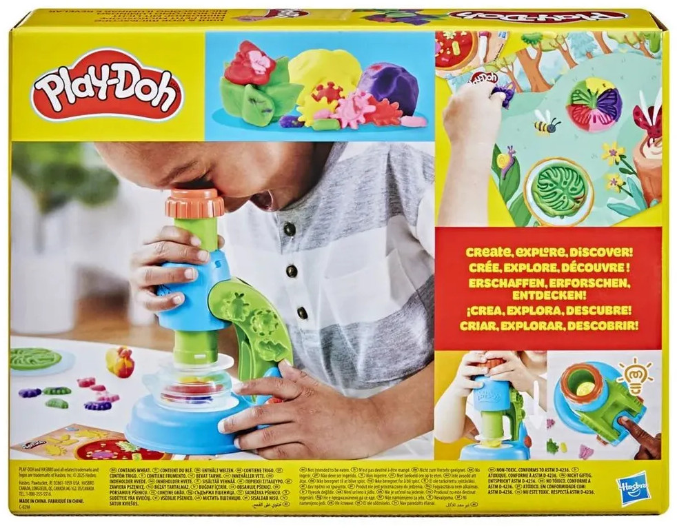 Восхищение и воображение засияют яркими красками с набором Play-Doh «Светящийся микроскоп»! Светящийся микроскоп придает эффект свечения творениям из Play-Doh, которые дети могут создавать на 4 прозрачных слайдах. Просто выбери слайд, наполни его материалом и нажми микроскоп, чтобы запечатать творение и активировать эффект WOW! Лепи из Play-Doh разноцветные растения, жучков и микробов, чтобы изучать их в чашке Петри. Игровой коврик с природной тематикой, 2 карточки с заданиями и 5 баночек массы для лепки Play-Doh вдохновят детишек на увлекательные игры и творчество. |