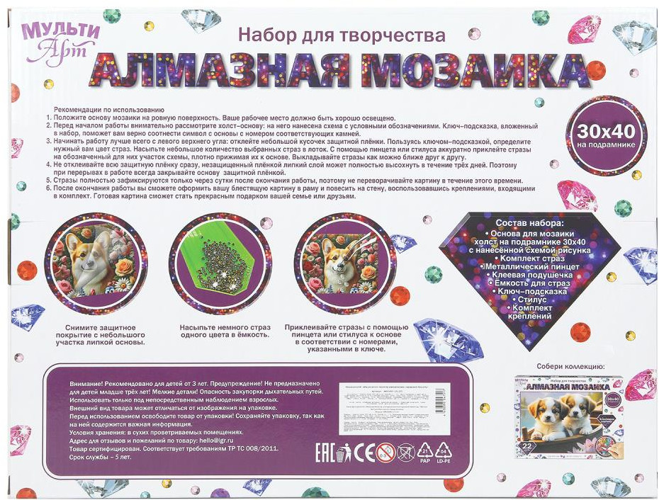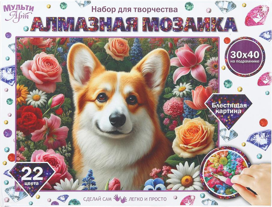 Набор для детского творчества — алмазная мозаика «Корги» ТМ «Мульти Арт» — отличный подарок для ребёнка, который будет способствовать развитию его творческих способностей. При помощи этого набора маленький художник сможет создать красивую картинку-мозаику, декорированную сверкающими стразами. Яркую блестящую поделку можно подарить близким или использовать для украшения комнаты. |