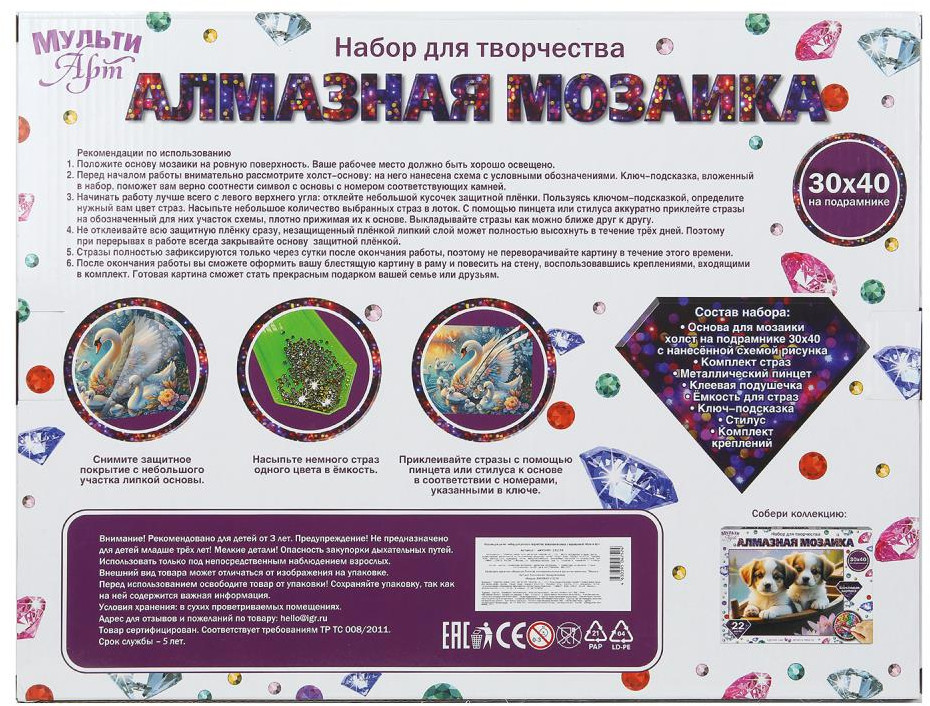 Набор для детского творчества — алмазная мозаика «Лебединая семья» ТМ «Мульти Арт» — отличный подарок для ребёнка, который будет способствовать развитию его творческих способностей. При помощи этого набора маленький художник сможет создать красивую картинку-мозаику, декорированную сверкающими стразами. Яркую блестящую поделку можно подарить близким или использовать для украшения комнаты.