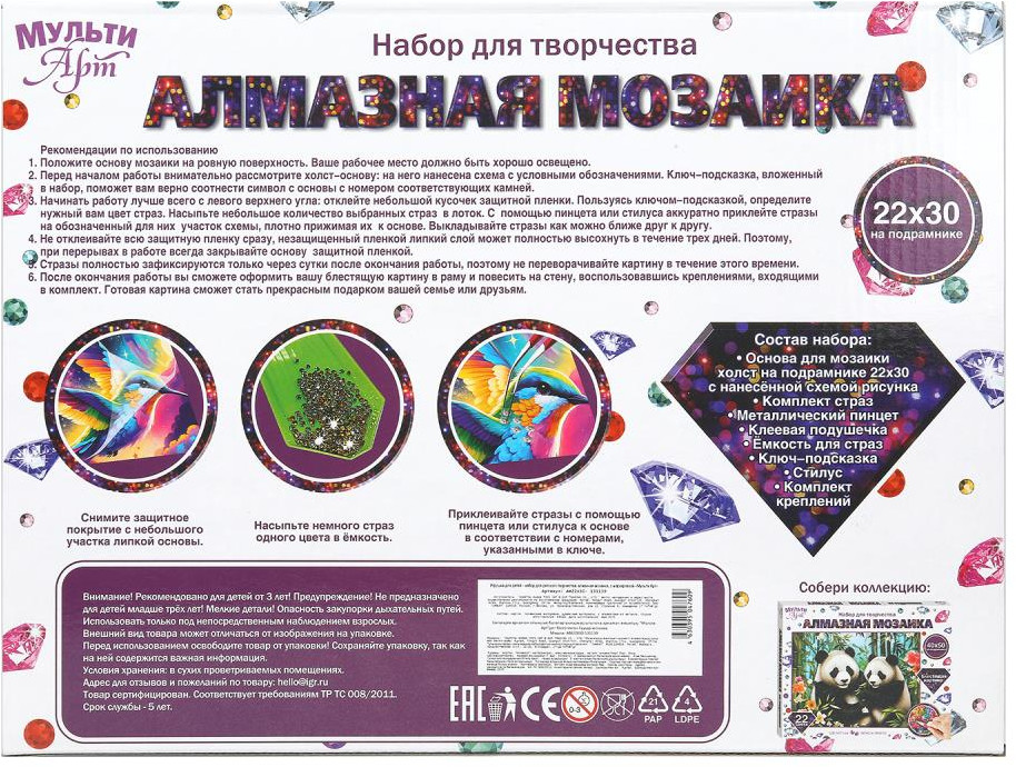 Набор для детского творчества – алмазная мозаика «Колибри» ТМ «Мульти Арт» - отличный подарок для ребёнка, который будет способствовать развитию его творческих способностей. При помощи этого набора маленький художник сможет создать красивую картинку-мозаику, декорированную сверкающими стразами. Яркую блестящую поделку можно подарить близким или использовать для украшения комнаты. |