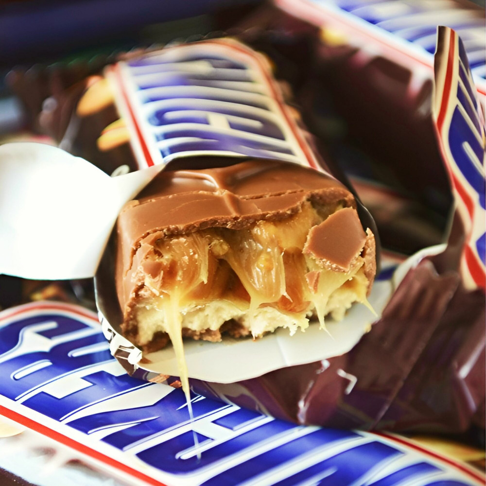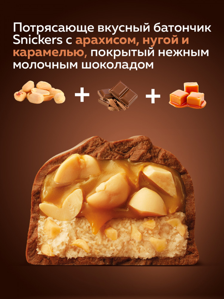 Карамель: арахис, глюкозный сироп (кукурузный, пшеничный), сахар, масло пальмовое рафинированное дезодорированное, сухое обезжиренное молоко, соль, ароматизатор (ванилин); молочный шоколад (общий сухой остаток какао – не менее 27 мес%, сухой молочный остаток – не менее 20%): сахар, какао масло, какао тертое, лактоза, сухое цельное молоко, сухая молочная сыворотка, молочный жир, эмульгатор (соевый лецитин), ароматизатор (ванилин); нуга: глюкозный сироп (кукурузный, пшеничный), сахар, арахис, масло пальмовое рафинированное дезодорированное, соль, сухой яичный белок. Может содержать незначительное количество фундука, миндаля, кешью. Трансизомеров ненасыщенных жирных кислот в шоколаде – не более 1%.