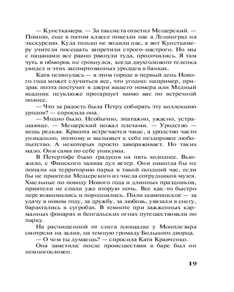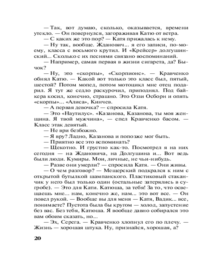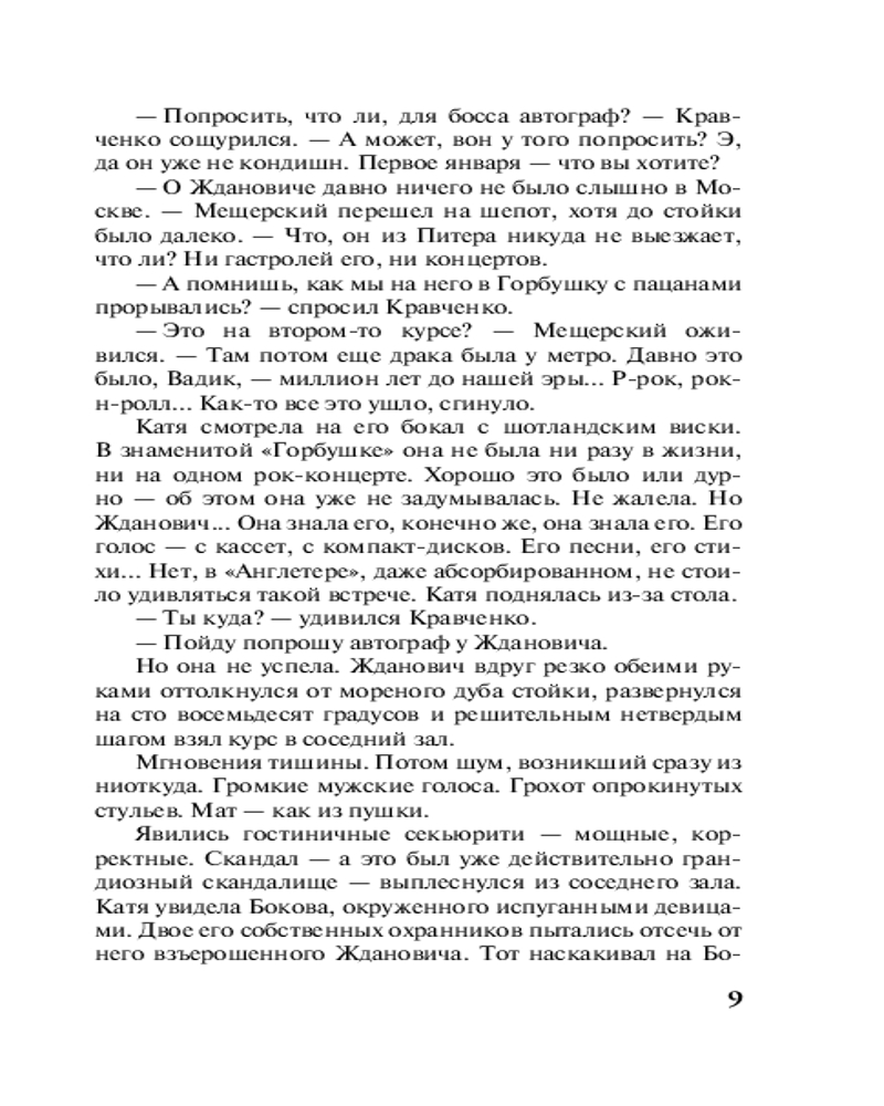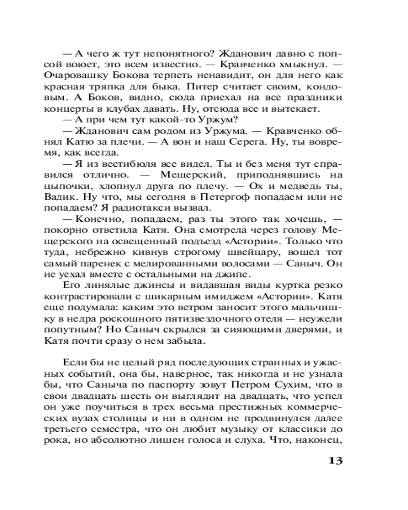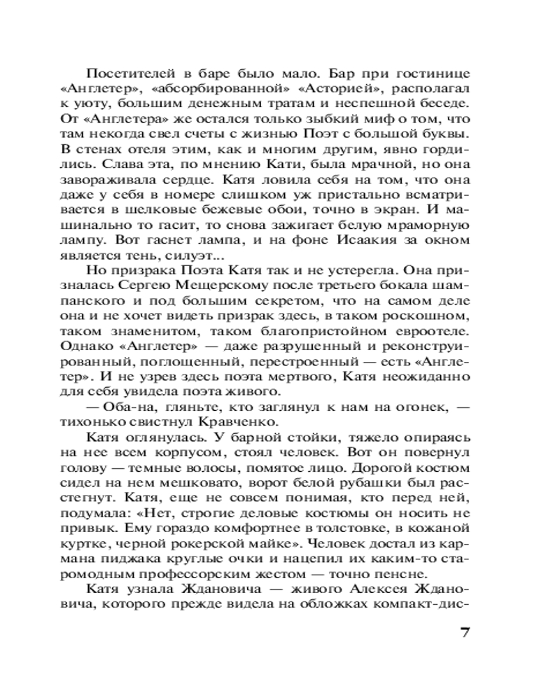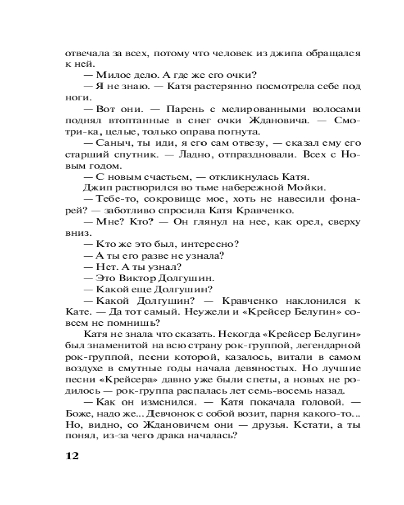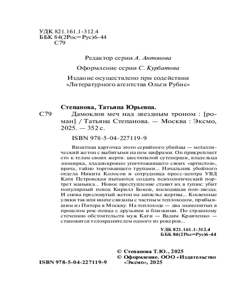 Серия: Большие тайны маленьких городов. Новое оформление (обложка) Визитная карточка этого серийного убийцы — металлический жетон с выбитыми на нем цифрами. Он прикрепляет его к телам своих жертв: шестипалой сутенерши, владельца зооцирка, хладнокровно уничтожившего своих «артистов», врача, тайно торговавшего трупами... Начальник убойного отдела Никита Колосов и сотрудница Пресс-центра УВД Катя Петровская пытаются создать психологический портрет маньяка... Новое преступление ставит их в тупик: убит популярный певец Кирилл Боков, восходящая поп-звезда. И снова пресловутый жетон на запястье жертвы... Косвенные улики так или иначе связаны с частным теплоходом, прибывшим из Питера в Москву. На теплоходе — два знаменитых в прошлом рок-певца с друзьями и близкими. По странному стечению обстоятельств муж Кати — Вадим Кравченко — становится телохранителем одного из рокеров... |