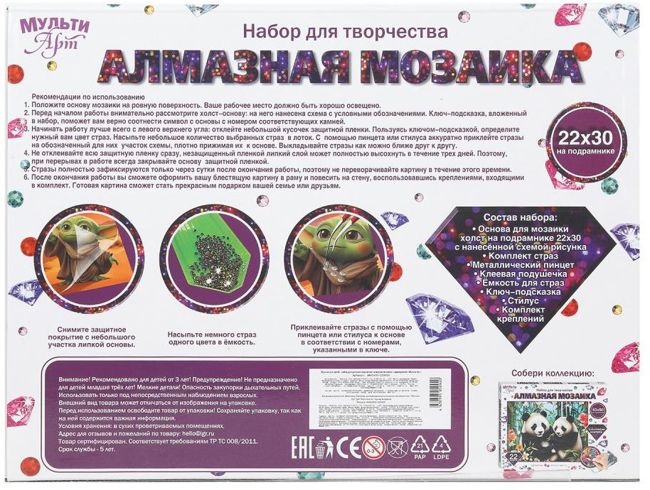 Набор для детского творчества — алмазная мозаика «Малыш Йода» ТМ «Мульти Арт» — отличный подарок для ребёнка, который будет способствовать развитию его творческих способностей. При помощи этого набора маленький художник сможет создать красивую картинку-мозаику, декорированную сверкающими стразами. Яркую блестящую поделку можно подарить близким или использовать для украшения комнаты. |