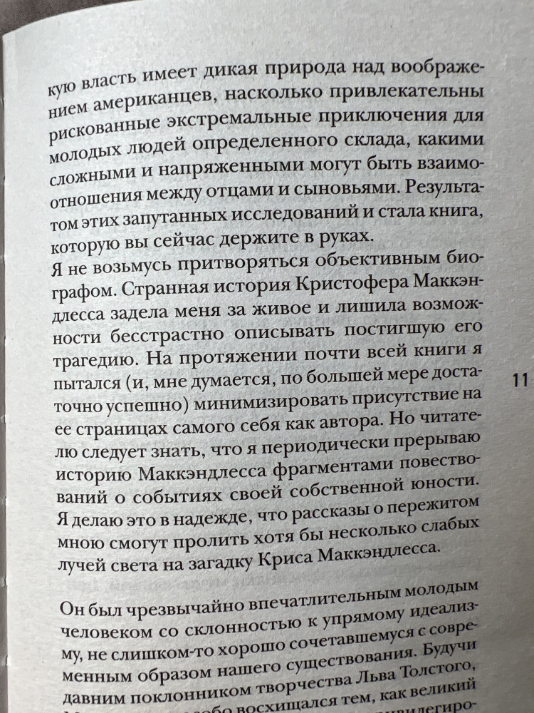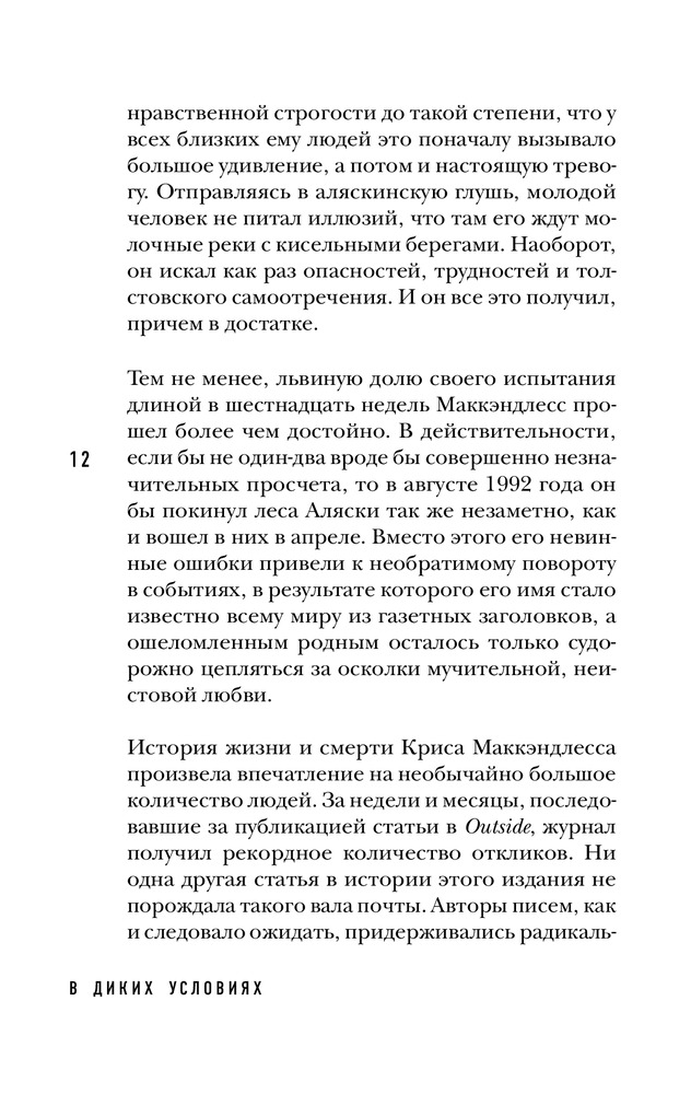 Эта книга, так же как и сам Крис Маккэндлесс останутся навсегда в моем сердце и душе. Это реальная история человека, который сделал то, на что большинство людей думающих/мечтающих о такой жизни, никогда не решатся.