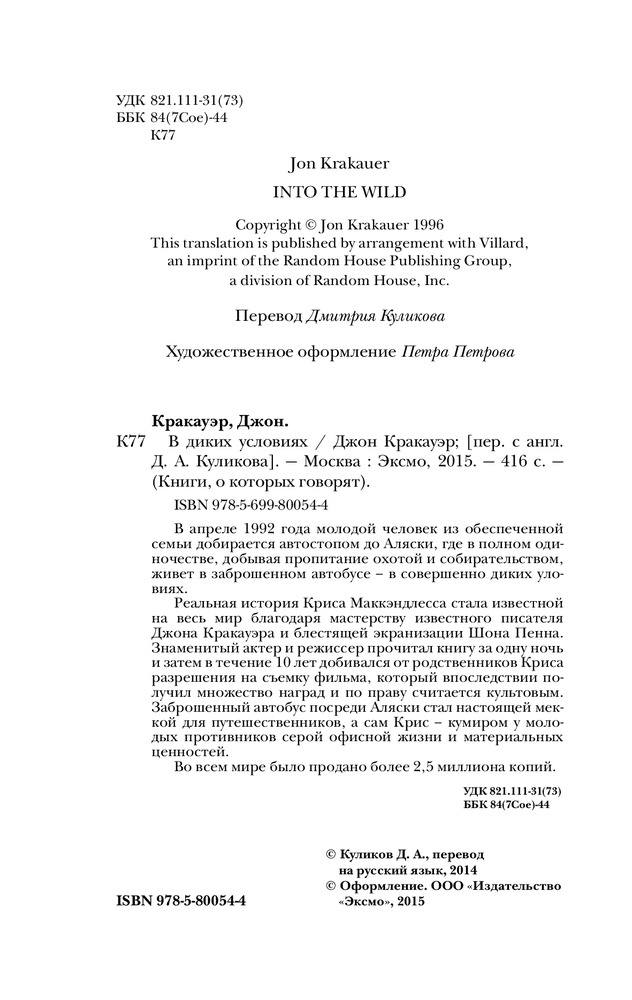 Серия: Книги, о которых говорят В апреле 1992 года молодой человек из обеспеченной семьи добирается автостопом до Аляски, где в полном одиночестве, добывая пропитание охотой и собирательством, живет в заброшенном автобусе – в совершенно диких уловиях. |