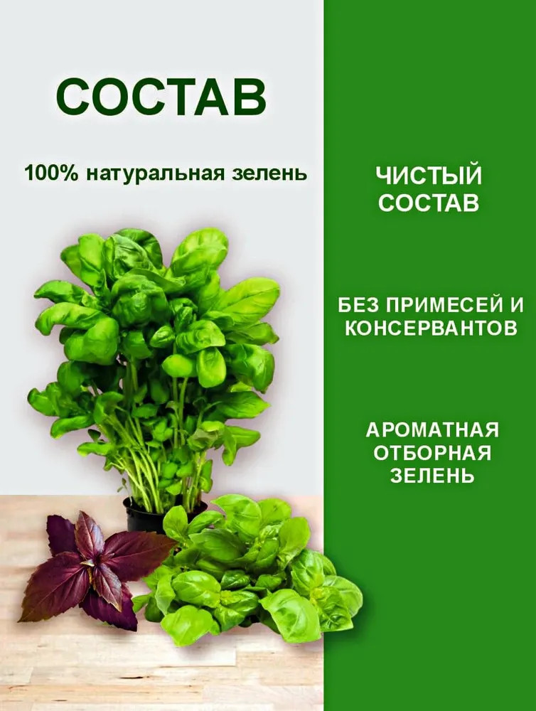 • удобство использования: забудьте о необходимости постоянно покупать свежий базилик. Наш продукт всегда готов к применению, экономит ваше время и усилия.