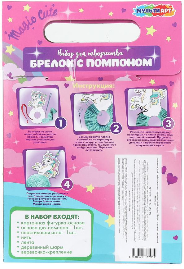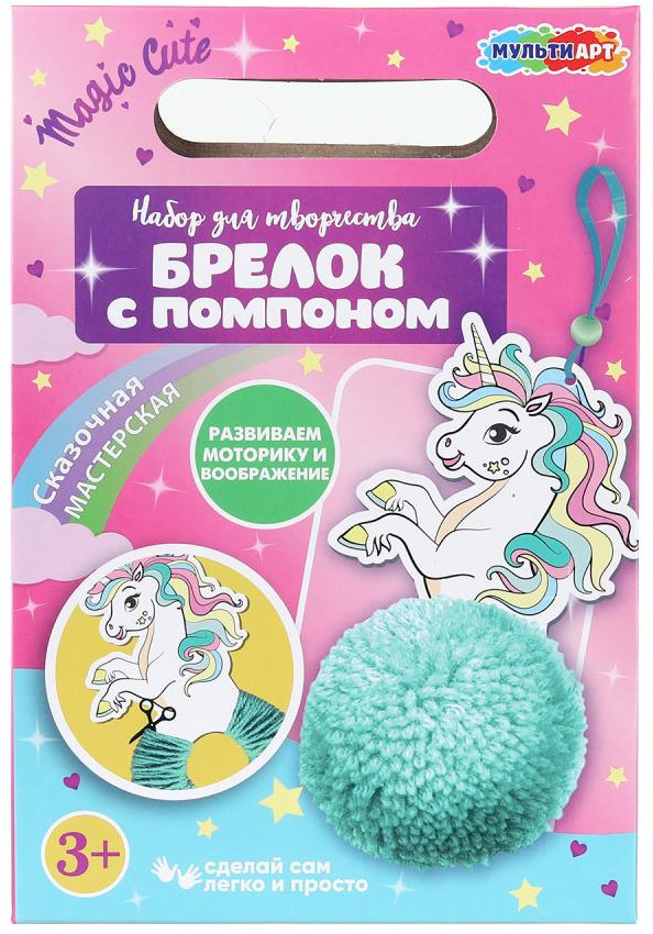 Серия: Сказочная мастерская Набор для детского творчества — брелок с помпоном «Единорожка» из серии «Сказочная мастерская» ТМ «Мульти Арт» — отличный подарок для ребёнка, который будет способствовать развитию его творческих способностей. При помощи этого набора маленькая рукодельница сможет создать красивый пушистый брелок с оригинальной фигурной основой сверху. Готовую поделку можно использовать в качестве украшения на сумку, рюкзак, пенал или телефон, а также подарить другу. Занятия с наборами для творчества ТМ «Мульти Арт» развивают: творческое мышление, мелкую моторику, внимание, воображение и аккуратность. |