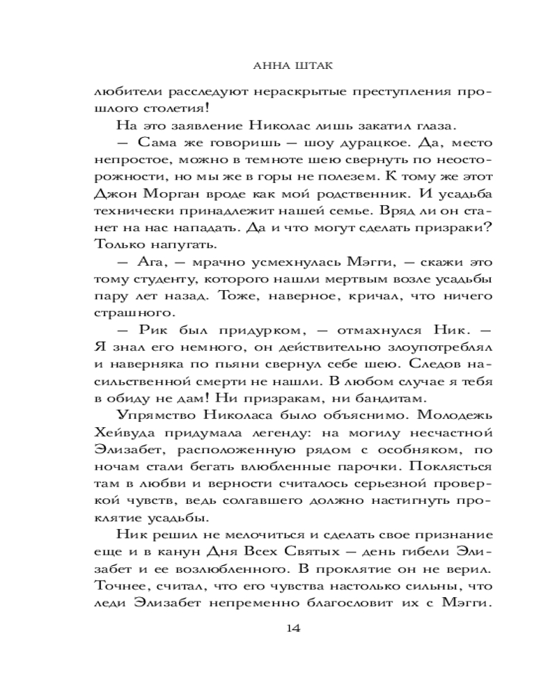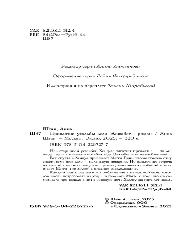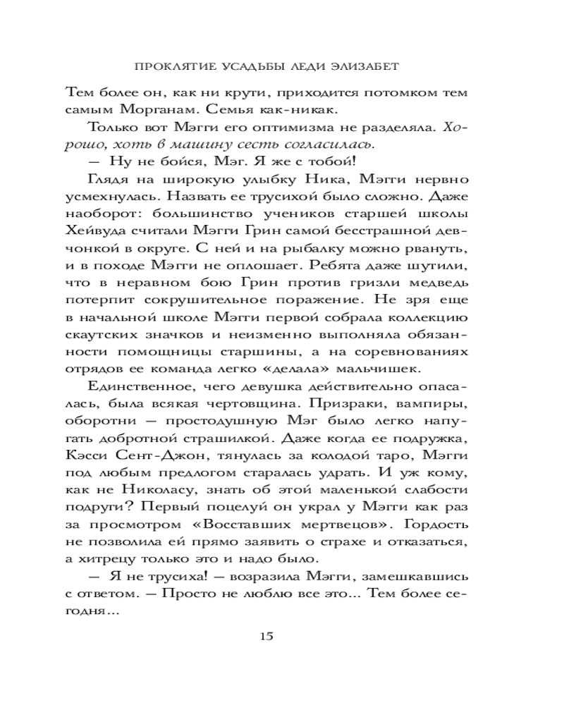 Серия: Клуб полуночных историй Над старинной усадьбой Хейвуда тяготеет проклятие — по легенде, здесь трагически погибли леди Элизабет и ее возлюбленный. Век спустя в Хейвуд приезжает Мэгги Грин, чтобы помочь отцу спасти семейное дело — маленькую пекарню. Но загадочная встреча на лесной тропинке запускает цепочку мистических событий и втягивает Мэгги и ее друзей в опасное расследование. Каждый шаг к разгадке — приближение к неведомой силе, готовой вновь потребовать жертву... и поведать Мэгги о том, что на самом деле произошло с ней в роковую ночь Хеллоуина пять лет назад. |