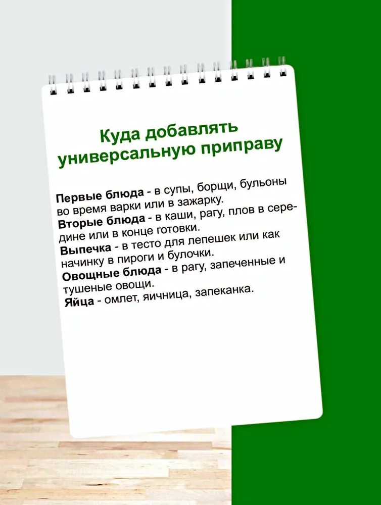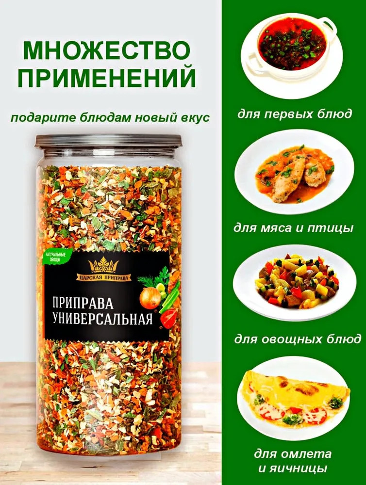 Смесь сушёных овощей универсальная — натуральная приправа для повседневной кухни. В составе: морковь, паприка, чеснок, томаты, пастернак, сельдерей, укроп, петрушка, куркума, базилик. Без соли, без глутамата и без консервантов.