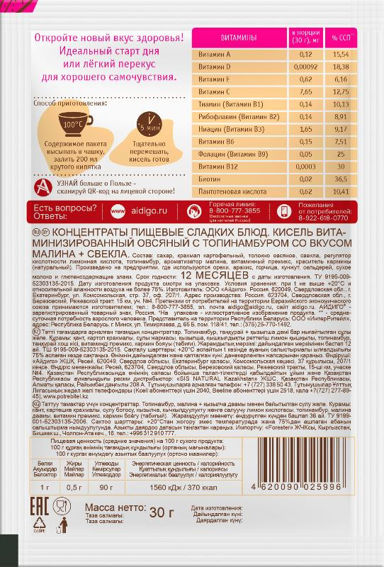 Айдиго Кисель овсяный моментальный с топинамбуром «Малина-свекла»