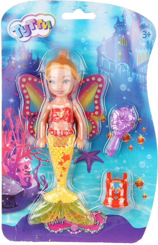 Кукла «Русалка» ТМ «Тутти» станет прекрасным подарком для девочки. Милая куколка в образе русалки с яркими крыльями и красивым подвижным хвостом непременно понравится вашей малышке. У русалочки яркие длинные волосы розового цвета, их можно заплетать в разнообразные причёски. Для ухода за волосами в наборе предусмотрена расчёска. Кукла выполнена из качественного пластика, её можно использовать при играх в воде. Игра с куклой ТМ «Тутти» развивает: воображение, фантазию, мелкую моторику, речь и социально-коммуникативные навыки. |