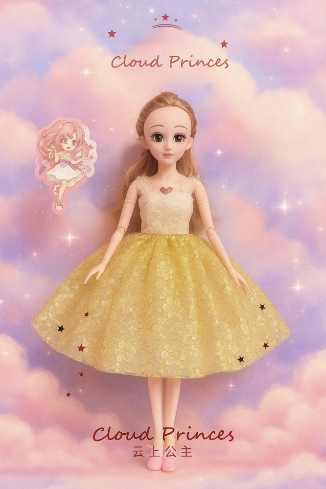 Кукла Cloud Princess — нежная принцесса из облаков в воздушном платье золотистого цвета. Её изящное лицо и длинные волосы делают образ особенно волшебным, а наряд с кружевным узором добавляет шарма и изысканности. Отличный подарок для девочек, которые любят сказочные истории, принцесс и волшебный мир фантазий. |