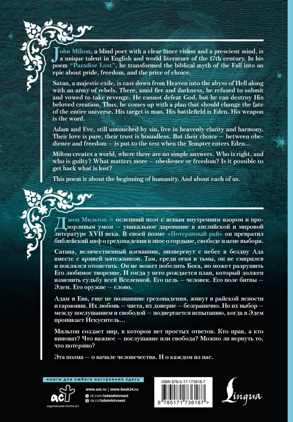 Серия: Bilingua подарочная: иллюстрированная книга на языке оригинала с переводом Джон Мильтон — ослепший поэт с ясным внутренним взором и прозорливым умом — уникальное дарование в английской и мировой литературе XVII века. В своей поэме «Потерянный рай» он превратил библейский миф о грехопадении в эпос о гордыне, свободе и цене выбора. Сатана, величественный изгнанник, низвергнут с небес в бездну Ада вместе с армией мятежников. Там, среди огня и тьмы, он не смирился и поклялся отомстить. Он не может победить Бога, но может разрушить Его любимое творение. И тогда у него рождается план, который должен изменить судьбу всей Вселенной. Его цель — человек. Его поле битвы — Эдем. Его оружие — слово. |
