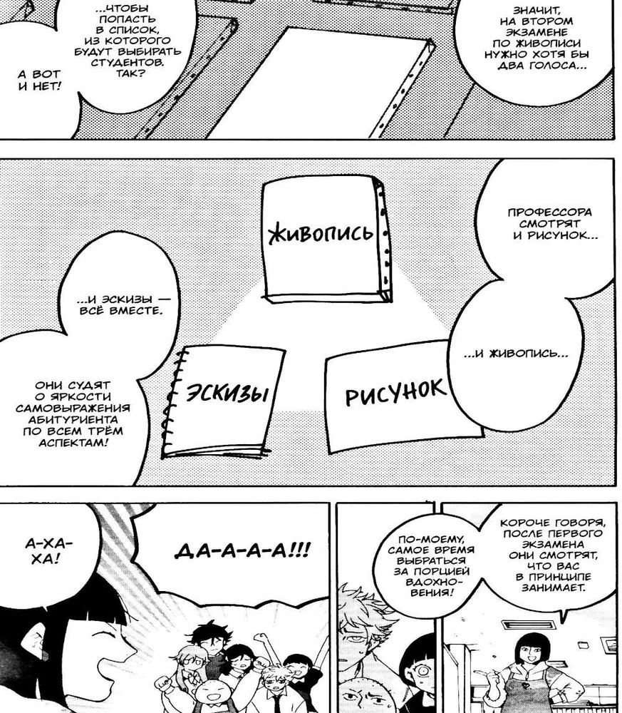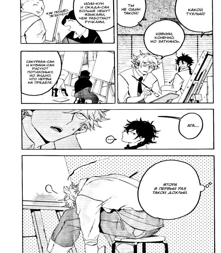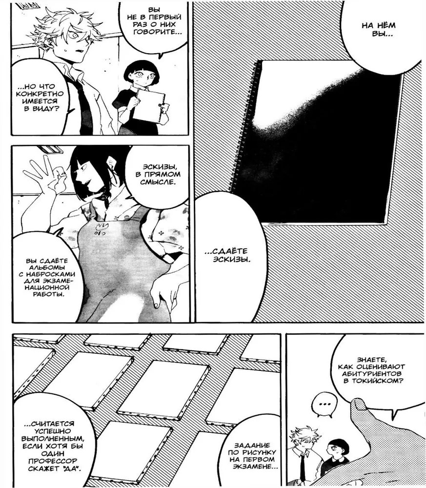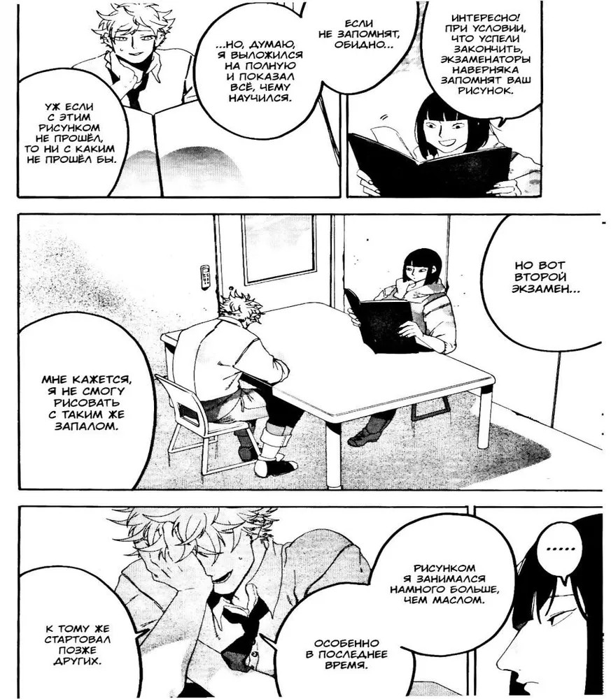 Не без происшествий, но первый этап экзамена позади. Вот только, узнав, что Рюдзи ушёл ещё до конца испытания, Ятора теперь не может обрести душевный покой и спокойно готовиться дальше. А ведь концентрация нужна ему перед трёхдневным экзаменом по живописи как никогда прежде! |