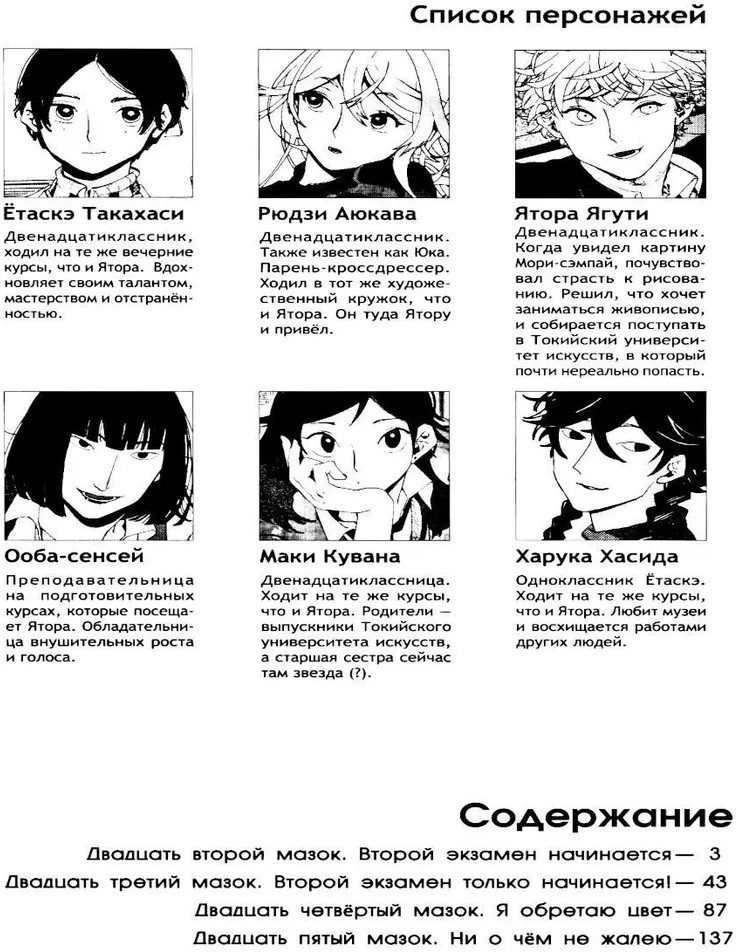 Парень, которому чего-то не хватало в простой повседневной жизни, окунулся в мир искусства. Так Ятора впервые столкнулся со страстностью своей натуры — и вступил в ожесточённую схватку за место в художественном мире. Кульминация арки вступительного экзамена в Токийский университет искусств! |