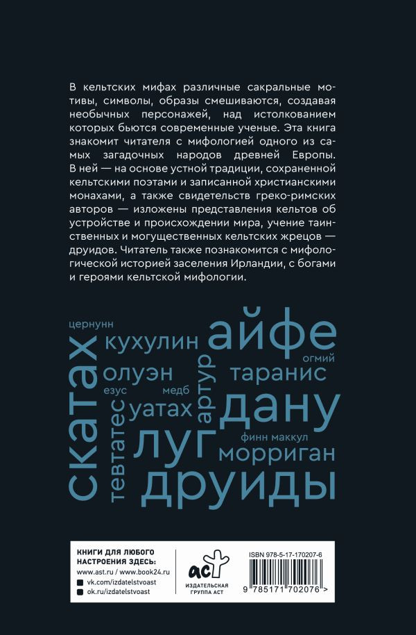 Серия: Мифы: мировое наследие В кельтских мифах различные сакральные мотивы, символы, образы смешиваются, создавая необычных персонажей, над истолкованием которых бьются современные ученые. Эта книга знакомит читателя с мифологией одного из самых загадочных народов древней Европы. В ней — на основе устной традиции, сохраненной кельтскими поэтами и записанной христианскими монахами, а также свидетельств греко-римских авторов — изложены представления кельтов об устройстве и происхождении мира, учение таинственных и могущественных кельтских жрецов — друидов. Читатель также познакомится с мифологической историей заселения Ирландии, с богами и героями кельтской мифологии. |