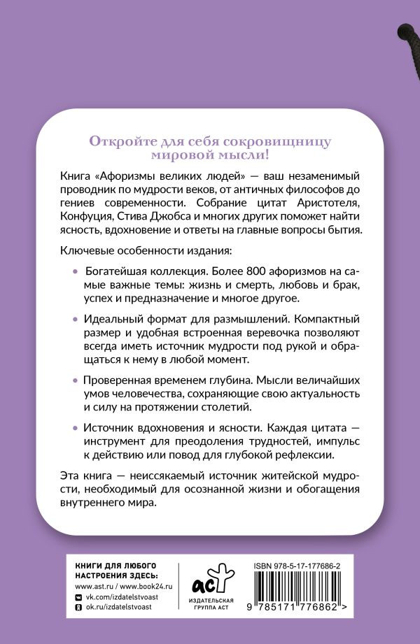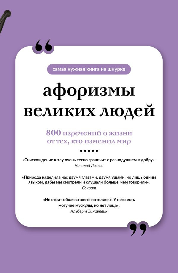 Серия: Самая нужная книга на шнурке Это уникальное собрание мудрости человечества, объединившее под одной обложкой проницательные афоризмы величайших мыслителей, философов, ученых и деятелей от глубокой древности до наших дней. Книга представляет собой масштабное путешествие сквозь эпохи: от бессмертных изречений Конфуция и Сократа до прозрений Леонардо да Винчи и Вольтера, и далее — к остроумным наблюдениям Марка Твена, гениальным прозрениям Альберта Эйнштейна, смелым идеям Стивена Хокинга и вдохновляющим мыслям Стива Джобса. |