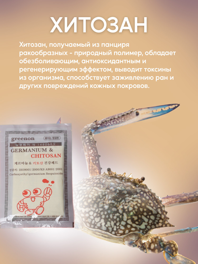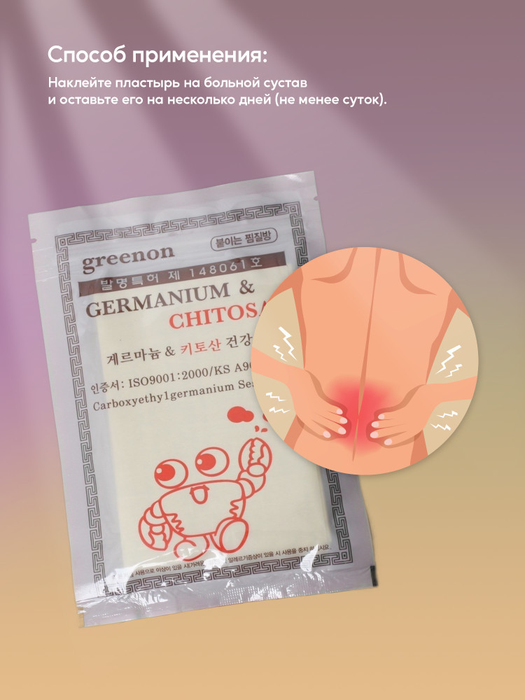 Корейский лечебный пластырь с германием и хитозаном, предназначенный для облегчения боли в мышцах, суставах, спине и шее. Пластырь оказывает обезболивающий, противовоспалительный и антибактериальный эффект, улучшает кровообращение и обмен веществ, способствует выводу токсинов, ускоряет восстановление, уменьшает отёчность. Хитозан — природный полимер, добываемый из панциря ракообразных — обладает регенерирующим, антиоксидантным действием, а германий в составе усиливает доставку кислорода к тканям и поддерживает защитные функции кожи и организма. |