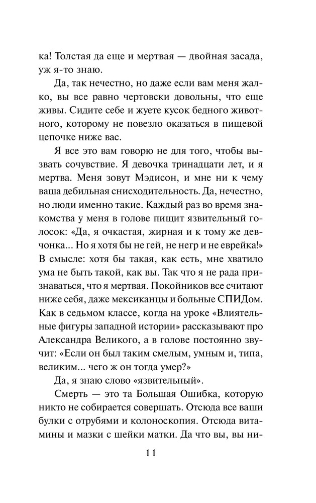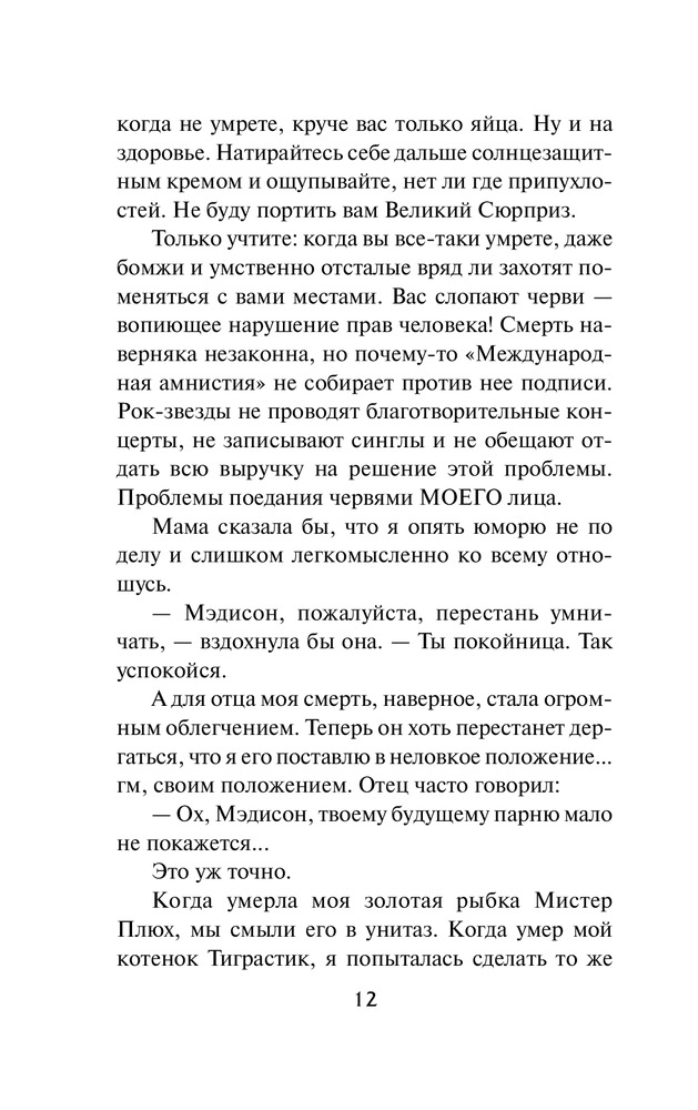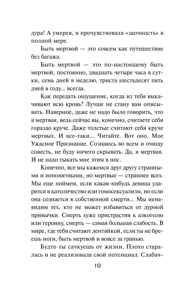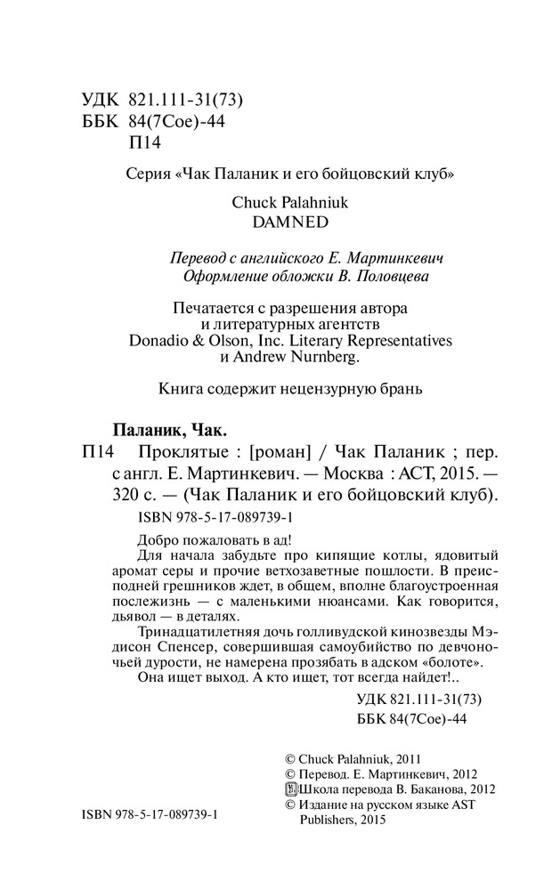 Замечательная книга, очень хорошо передает стиль автора. Если не знаете, что прочитать после знаменитого "Бойцовского клуба", то этот роман - самое то, на мой взгляд. Что касается оформления, у меня Паланик весь в этих черных обложках. Они очень качественно исполнены. Не остаются следы пальцев на обложке, корешок не сыпется, страницы не выпадают. Для такой цены даже неожиданно - очень крепкая хорошая обложка. Единственный минус - краска на страницах смазывается, лучше вообще не касаться текста пальцами. Зато цвет страниц приятный, не ярко-белый, легко читаемый шрифт.