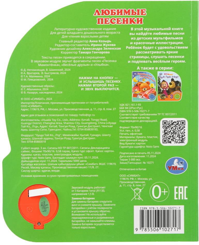 Серия: Союзмультфильм Музыкальная книга «Союзмультфильм. Любимые песенки» ТМ «УМка» станет прекрасным подарком для малыша. Ребёнок с удовольствием будет листать плотные страницы, рассматривать яркие картинки и, конечно, нажимать на кнопку и слушать песенки из известных детских мультфильмов. Малыш легко освоит включение звука: по нажатию на кнопку песенка включится, при втором нажатии выключится, при третьем — заиграет следующая композиция. Благодаря удобному формату книгу можно взять с собой в путешествие. |