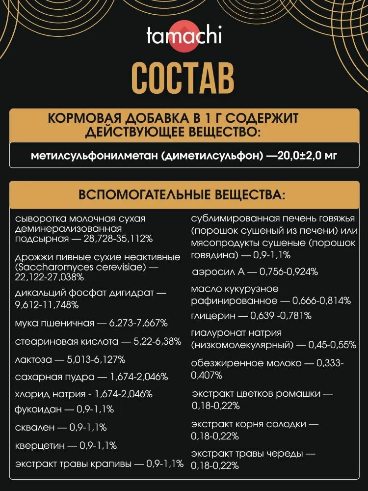 Кормовая добавка в 1 г содержит действующее вещество: метилсульфонилметан (диметилсульфон) — 20,0±2,0 мг; вспомогательные вещества: сыворотка молочная сухая деминерализованная подсырная — 28,728-35,112%, дрожжи пивные сухие неактивные (Saccharomyces cerevisiae) — 22,122- 27,038%, дикальций фосфат дигидрат — 9,612-11,748%, мука пшеничная — 6,273-7,667%, стеариновая кислота — 5,22-6,38%, лактоза — 5,013-6,127%, сахарная пудра — 1,674-2,046%, хлорид натрия - 1,674-2,046%, фукоидан — 0,9-1,1%, сквален — 0,9-1,1%, кверцетин — 0,9-1,1%, экстракт травы крапивы — 0,9-1,1%, сублимированная печень говяжья (порошок сушеный из печени) или мясопродукты сушеные (порошок говядина) — 0,9-1,1%, аэросил А — 0,756-0,924%, масло кукурузное рафинированное — 0,666-0,814%, глицерин — 0,639 -0,781%, гиалуронат натрия (низкомолекулярный) — 0,45-0,55%, сухое обезжиренное молоко — 0,333-0,407%, экстракт цветков ромашки — 0,18-0,22%, экстракт травы череды — 0,18-0,22%, экстракт корня солодки — 0,18-0,22%.