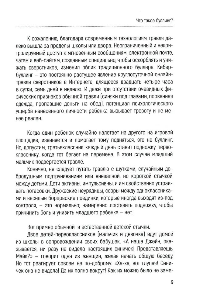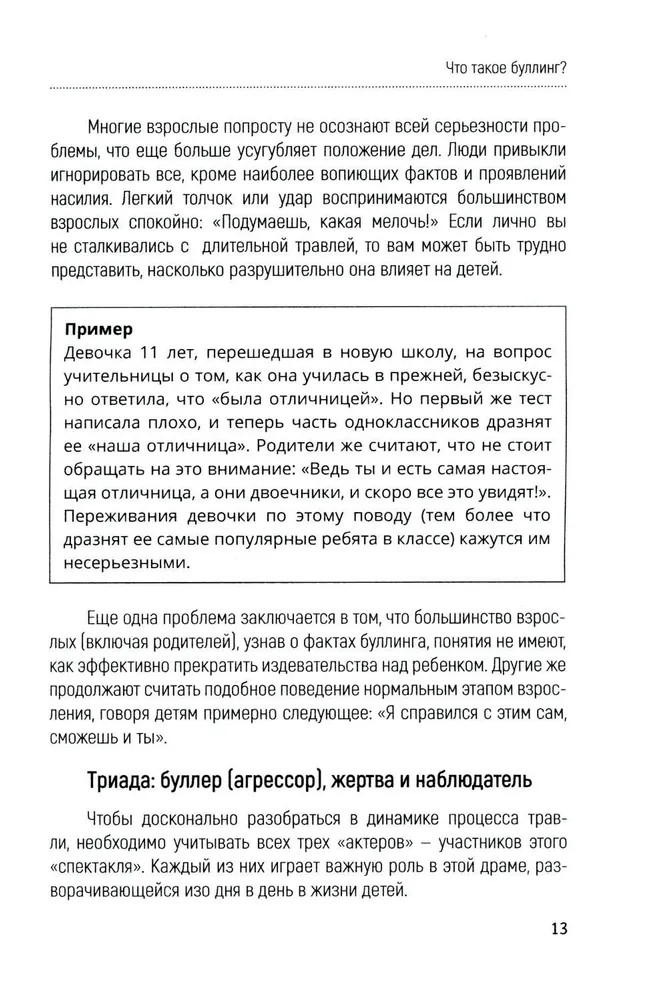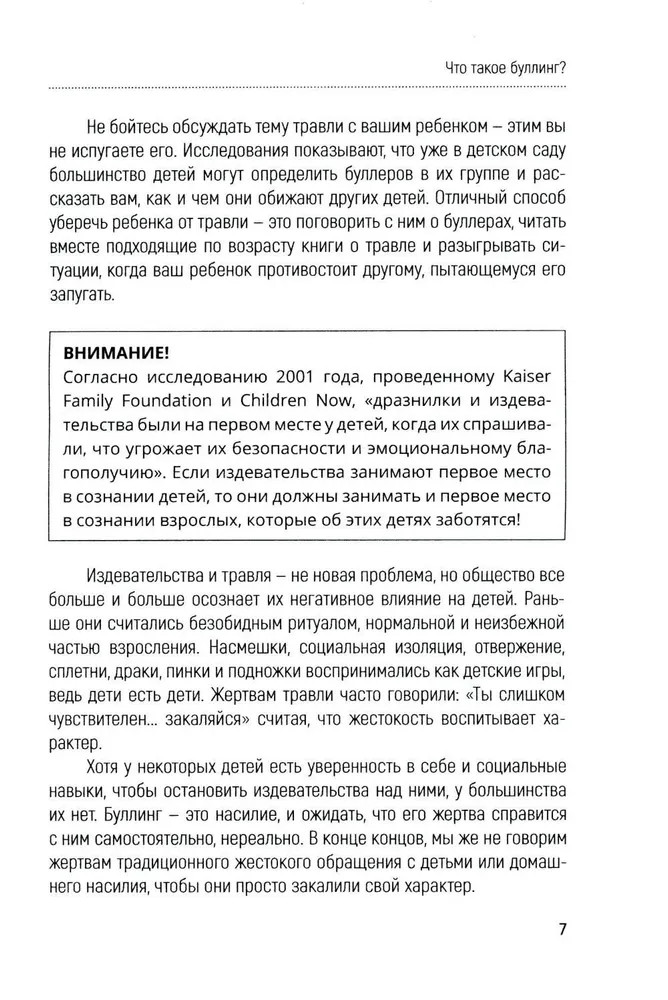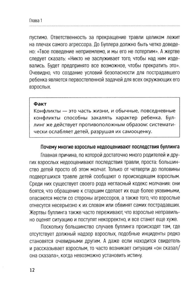 Буллинг, к сожалению, очень распространенное явление, и часто ни родители, ни учителя просто не знают о том, что происходит. А при возникновении его признаков могут их игнорировать, что заставляет ребенка или подростка чувствовать себя совершенно одиноким и беспомощным. Однако буллинг можно остановить и предотвратить. Эта книга, написанная на основе научных исследований и многолетнего опыта работы автора, научит вас, как это сделать. Чем больше вы узнаете о том, что такое буллинг — как, где и почему он возникает, что делать, если вы подозреваете, что над вашим ребенком издеваются (или же он издевается над другими) — тем лучше вы будете подготовлены, чтобы ему помочь. В ней вы найдете эффективные практические советы и рекомендации, которые дадут всем детям и родителям надежду на счастливое будущее — будущее без буллинга. Для родителей, учителей и всех, интересующихся вопросами психологии и воспитания детей и подростков. |