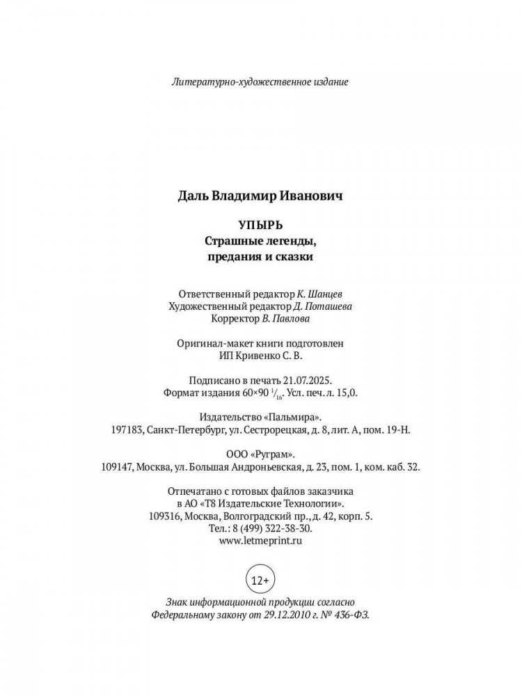 Серия: Пальмира — готика Современному читателю Владимир Иванович Даль (1801-1872) известен прежде всего как лексикограф, составивший многотомный «Толковый словарь живого великорусского языка», который до сих пор активно используется филологами и историками. Однако литературная деятельность Даля также заслуживает пристального внимания, ведь писатель оставил после себя множество сказок, рассказов и повестей, которые были высоко оценены его современниками. Проза, вошедшая в настоящий сборник, объединяет в себе мистический и фольклорный элементы и во многом основана на этнографических наблюдениях писателя — в ней Даль изображает самобытную народную культуру с присущей ей верой в колдунов, упырей, духов и нечистую силу. |