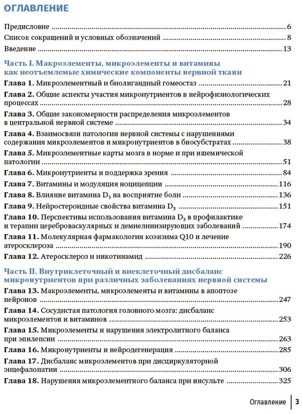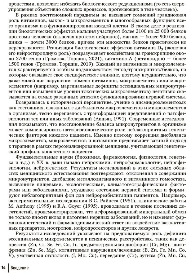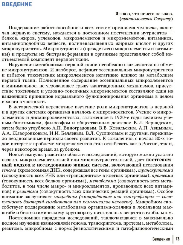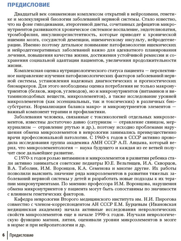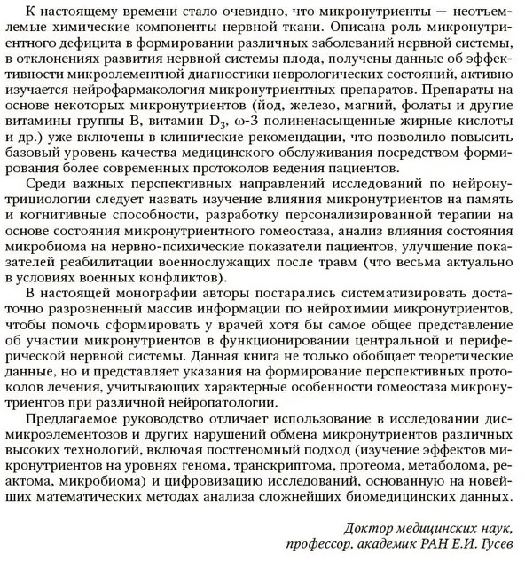 Микронутриенты (макро- и микроэлементы, витамины и др.) участвуют в разнообразных нейрофизиологических процессах. В руководстве роль микронутриентов рассмотрена с помощью системно-биологических методов биоинформатики в парадигме постгеномных исследований. Даны характеристики нарушений обмена микроэлементов при заболеваниях центральной и периферической нервной системы (ишемический инсульт, хроническая ишемия мозга, артериальная гипертензия, полиневропатия, болезнь Альцгеймера, боковой амиотрофический склероз, рассеянный склероз, миопатии, синдром дефицита внимания с гиперактивностью, расстройства аутистического спектра, неврологические нарушения, связанные с дефицитами и перегрузкой микроэлементами). Приведены результаты экспериментальных и клинических исследований, продемонстрировавших терапевтические свойства микронутриентных препаратов при различных патологиях нервной системы. |