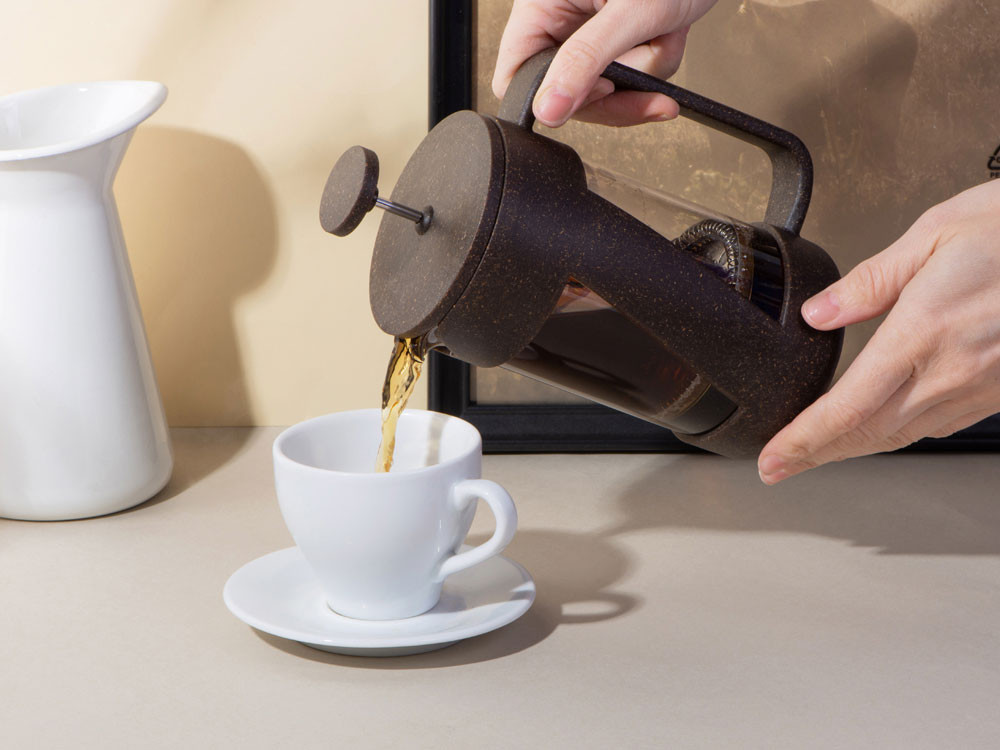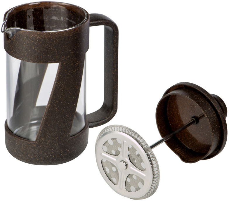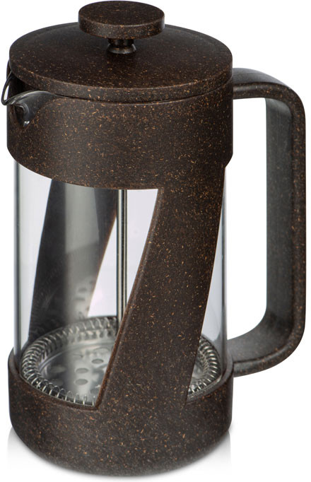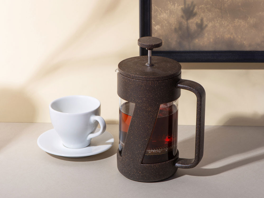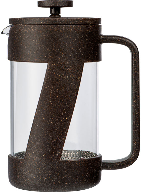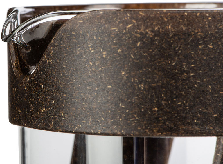 Оплетающая стеклянную колбу часть выполнена из переработанных кофейных зерен, смешанных с пластиком и древесными волокнами. Емкость выполнена из жаропрочного боросиликатного стекла, крепкого и более легкого, чем обычное, а также которое способно выдержать нагрев до 120 градусов Цельсия. Подходит для заваривания кофе и чая, имеет комфортный объем 600 мл, которого как раз хватит на пару чашек.