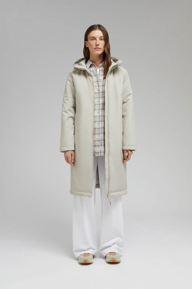 Внутри изделия высокотехнологичный искусственный утеплитель, который отличается легкостью, а благодаря особой структуре из множества тончайших волокон отлично согревает. Легкий и прочный подклад обработан антибактериальной и полиуретановой пропитками, которые предотвращают развитие микрофлоры и продлевают срок службы изделия. Несъемный капюшон защитит от ветра и осадков. Предусмотрены функциональные карманы. Пальто застегивается на центральную молнию.