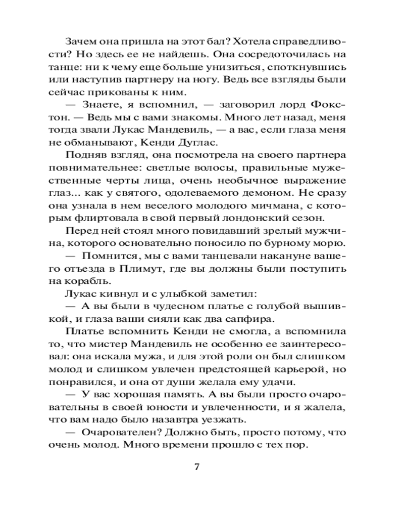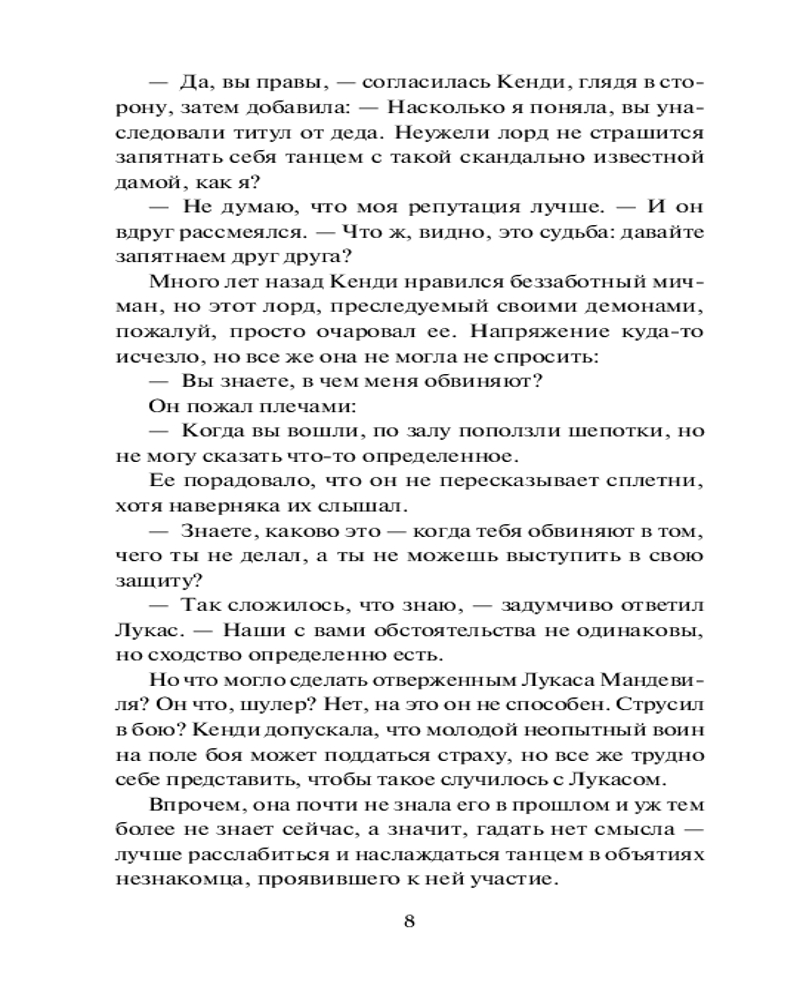 Серия: Шарм Репутация леди Кенди Деншир загублена. Бывший муж, развратник и негодяй, опозорил ее, обманом добился развода через суд и отнял у нее сына. Светское общество не принимает Кенди и с удовольствием обсуждает за ее спиной возмутительные слухи о немыслимом разврате молодой женщины. Однажды на балу Кенди встречает еще одного изгоя. Лорд Лукас Фокстон храбро сражался в Наполеоновских войнах, но был ранен и попал в плен. Сбежав из плена, он нарушил данное им слово и теперь также считает себя опозоренным. Проникнувшись симпатией к истории Кенди, Лукас предлагает ей помощь в восстановлении доброго имени леди. |