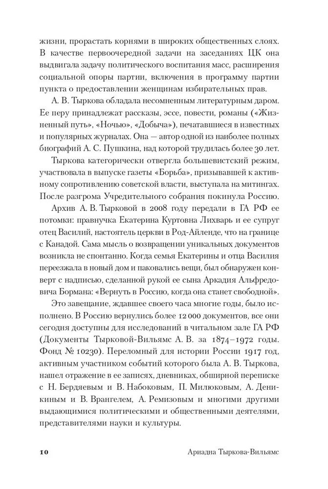 Ариадна Тыркова-Вильямс — одна из немногих женщин-политиков, принимавших активное участие в демократических преобразованиях в России на рубеже XIX–XX веков. Она выступала за создание в стране конституционного строя и сыграла заметную роль в организации и деятельности первой Государственной думы в России, была одной из основательниц и активных участниц Конституционно-демократической партии (кадетов). |