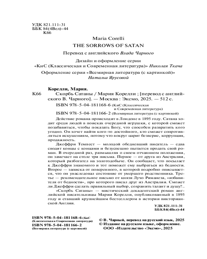Серия: КиС (Классическая и Современная литература) Действие романа происходит в Лондоне в 1895 году. Сатана ходит среди людей в поисках очередной игрушки, с которой сможет позабавиться, чтобы показать Богу, что может развратить кого угодно. Он хочет найти кого-то достойного, кто сможет сопротивляться искушениям, что будет сложно, потому что вокруг царит безверие, коррупция, продажность.